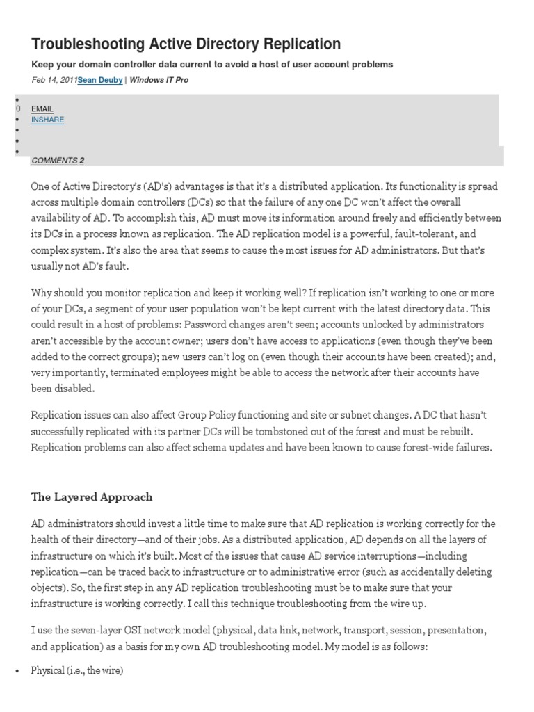 objects). So, the first step in any AD replication troubleshooting must be to make sure that your