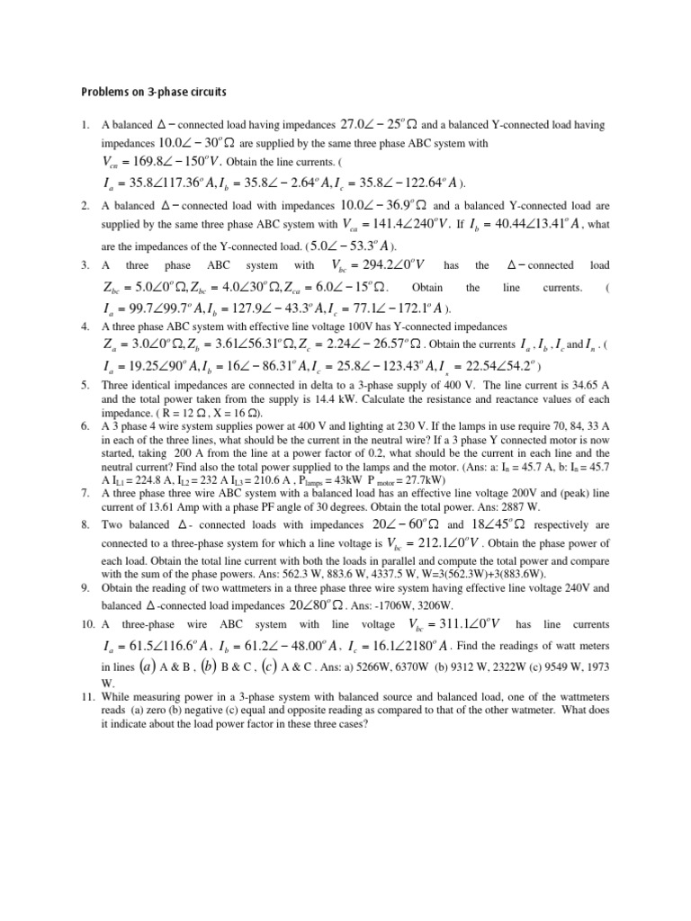 current of 13.61 Amp with a phase PF angle of 30 degrees. Obtain the total power. Ans: 2887 W.