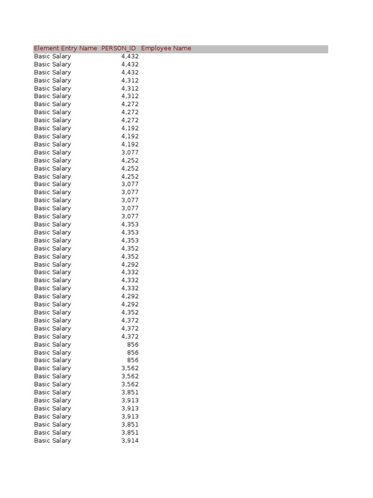 Element Entry Name PERSON_ID Employee Name