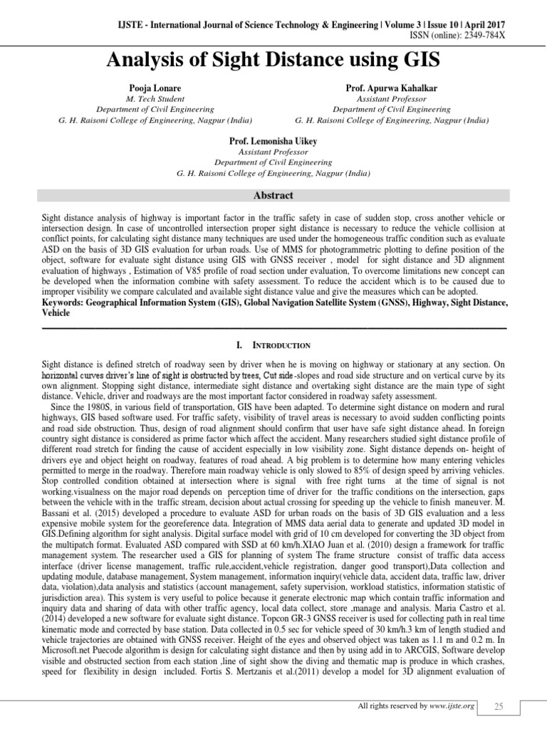 Keywords: Geographical Information System (GIS), Global Navigation Satellite System (GNSS), Highway, Sight Distance,