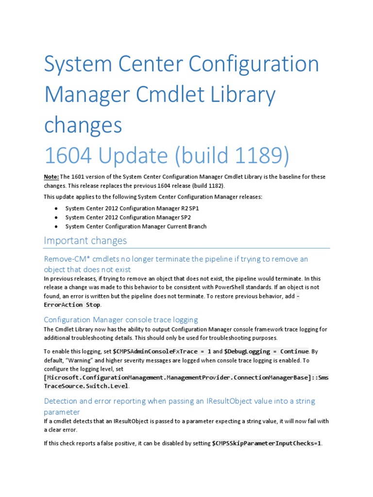 Note: The 1601 version of the System Center Configuration Manager Cmdlet Library is the baseline for these