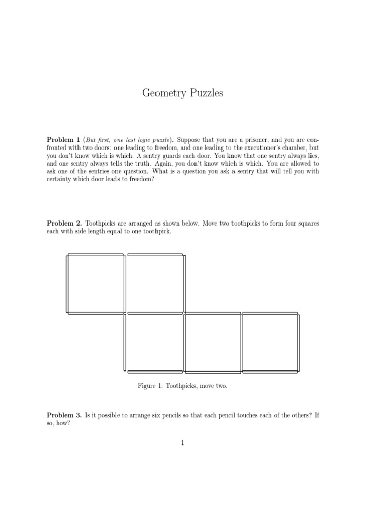 Problem 6. Draw six lines segments to form eight triangles. See if you can find two different ways