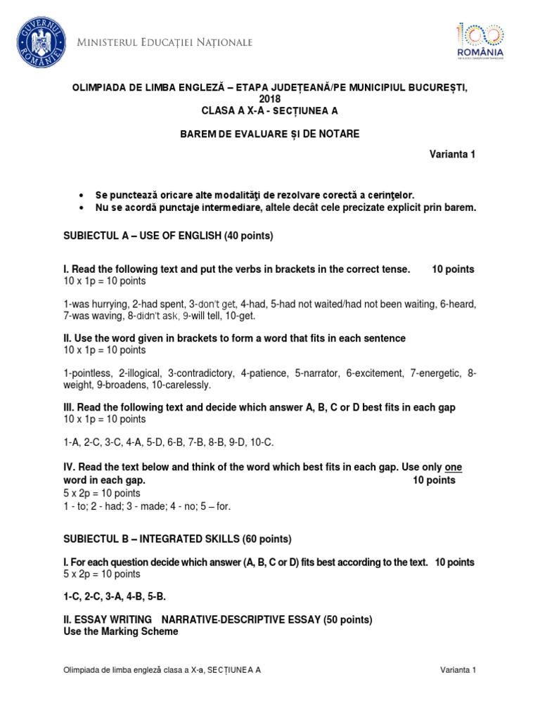 Olimpiada de limba engleză clasa a X-a, SECȚIUNEA A Varianta 1