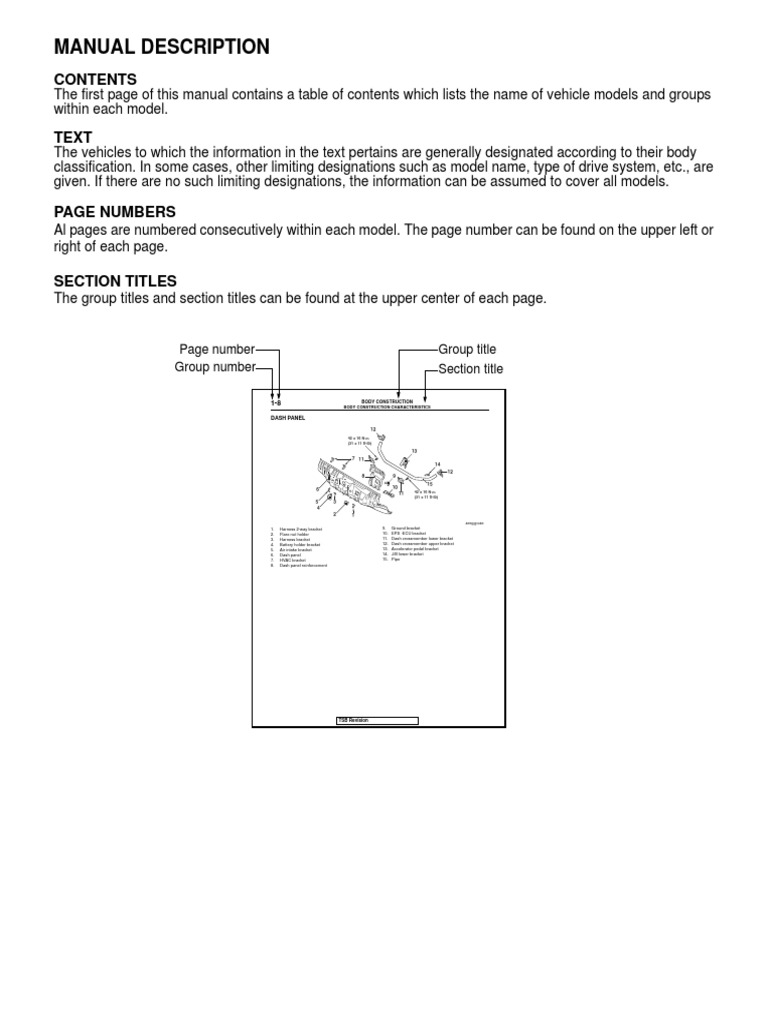 The first page of this manual contains a table of contents which lists the name of vehicle models and groups