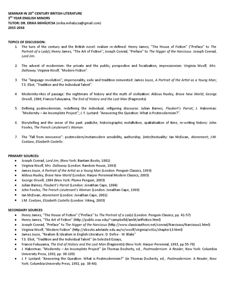 5. Defining postmodernism, redefining the individual, refiguring discourse: Julian Barnes, Flaubert’s Parrot; J. Habermas: