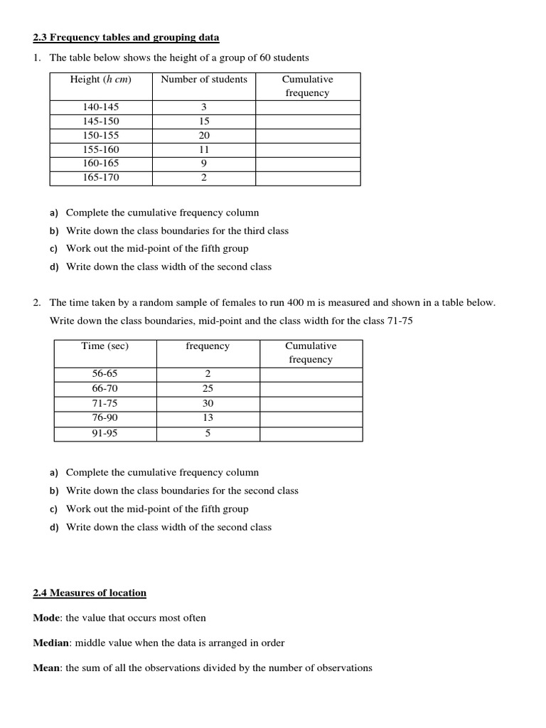 2. The time taken by a random sample of females to run 400 m is measured and shown in a table below.