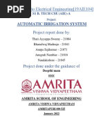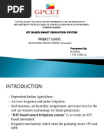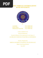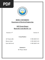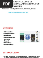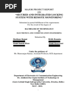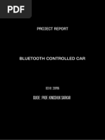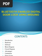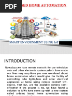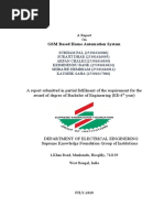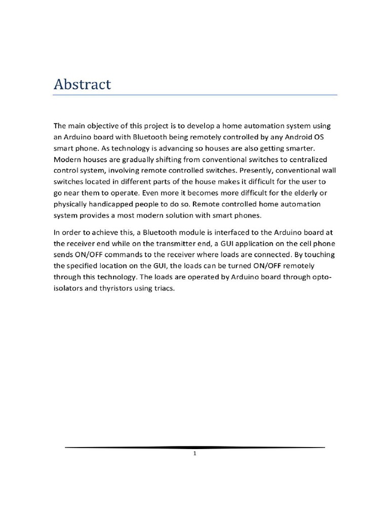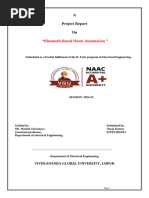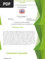 Abstract The main objective of this project is to develop a home automation system using an Arduino board with Bluetooth being remotely controlled by any Android OS smart phone. As technology is advancing so houses are also getting smarter. Modern houses are gradually shifting from conventional switches to centralized control system, involving remote controlled switches. Presently, conventional wall switches located in different parts of the house makes it difficult for the user to go near them to operate. Even more it becomes more difficult for the elderly or physically handicapped people to do so. Remote controlled home automation system provides a most modern solution with smart phones. In order to achieve this, a Bluetooth module is interfaced to the Arduino board at the receiver end while on the transmitter end, a GUI application on the cell phone sends ON/OFF commands to the receiver where loads are connected. By touching the specified location on the GUI, the loads can be turned ON/OFF remotely through this technology. The loads are operated by Arduino board through opto- isolators and thyristors using triacs.Acknowledgement First and foremost, I would like to take this opportunity to thank our lecturer Mr. Monish Gupta forhis guidance and advice on this project. At the same time I also won’t forget my group participant and also friends to because they quite good with sharing some of their information to complete this final year project successfully. Last but not least, | am very grateful to our College, lecture sand friends where they gave us enough of time to complete this project and at the same time I would like to thank my friends and classmates who helps me a lotto complete this project. Thank You.Introduction Nowadays, we have remote controls for our television sets and other electronic systems, which have made our lives real easy. Have you ever wondered about home automation which would give the facility of controlling tube lights, fans and other electrical appliances at home using a remote control? Off-course, Yes! But, are the available options cost-effective? If the answer is No, we have found a solution to it. We have come up with a new system called Arduino based home automation using Bluetooth. This system is super-cost effective and can give the user, the ability to control any electronic device without even spending for a remote control, This project helps the user to control all the electronic devices using his/her smartphone. Time is a very valuable thing, Everybody wants to save time as much as they can. New technologies are being introducedto save our time. To save people's time ‘we are introducing Home Automation system using Bluetooth . With the help of this system you can control your home appliances from your mobile phone. You can turn on/off your home appliances within the range of Bluetooth.Project Aim The aim of the project is to design and construct a home automation system that ‘will remotely switch on or off any household appliances connected to it, using a microcontroller , voice dial on phone, or Bluetooth based android application. Project Objective The objective of this project is to implement a low cost, reliable and scalable home automation system that can be used to remotely switch on or off any household appliance, using a microcontroller to achieve hardware simplicity low cost short messaging service for feedback and voice dial from any phone to ‘toggle the switch state. Project scope and limitation ‘This project work is complete on its own in remotely and automatically switching on or off of an electrical appliance not limited to household appliances and sends a feedback message indicating the new present state of the appliance.Description of the Project This projectis one of the important Arduino Projects. Arduino based home automation using Bluetooth project helps the user to control any electronic device using Device Control app on their Android Smartphone. The android app sends commands to the controller ~ Arduino, through wireless communication, namely, Bluetooth. The Arduino is connected to the main PCB which has five relays as shown in the block diagram. These relays can be connected to different electronic devices. As per the block diagram, Device 1 ~ Buzzer, Device 2- Fan, Device 3 ~Lights. When the user presses on the ‘On’ button displayed on the app for the device 1, the Buzzer is switched on. This Buzzer can be switched off, by pressing the same button again. Similarly, when the user presses on the ‘On’ button displayedon the app for the device 2, the fan is switched on. The fan can be switched off, by pressing the same button again. This project of home automation using Bluetooth and Arduino can be used for controlling any AC or DC devices. In the demonstration, we have used DC Fan and DC Bulb. To drive this DC Fan and Light, a 9V battery is connected.Hardware Requirement ‘The list of components mentioned here are specifically for controlling 4 different loads. Arduino Uno with Atmega 328P microcontroller HC—05 Bluetooth Module 10 KO Resistor 1KQ Resistor X 4 BCS47 NPN Transistor X 4 1N4007 Diode X4 5V Relay X 4 Prototyping board (Bread board) Connecting wires 9V Power supply Smartphone or tablet (Bluetooth enabled} vv vv vw Software Requirement > Arduino 1.6.9 compiler > Proteus 7 Android applicationDescription of Hardware Required Arduino uno ‘The Arduino Uno is a microcontroller board based on the ATmega328P . ithas 14 digital input/output pins (of which 6 can be used as PWM outputs), 6 analog inputs, a 16 MHez crystal oscillator, a USB.connection, a power jack, an |CSP header, anda reset button. It contains everything needed to support the microcontroller; simply connect it to a computer with a USB cable or power it with a AC-to-DC adapter or batteryto get started. ‘The Uno differs from all preceding boards in that it does not use the FTDI USB-to- serial driver chip. Instead, it features the Atmega8