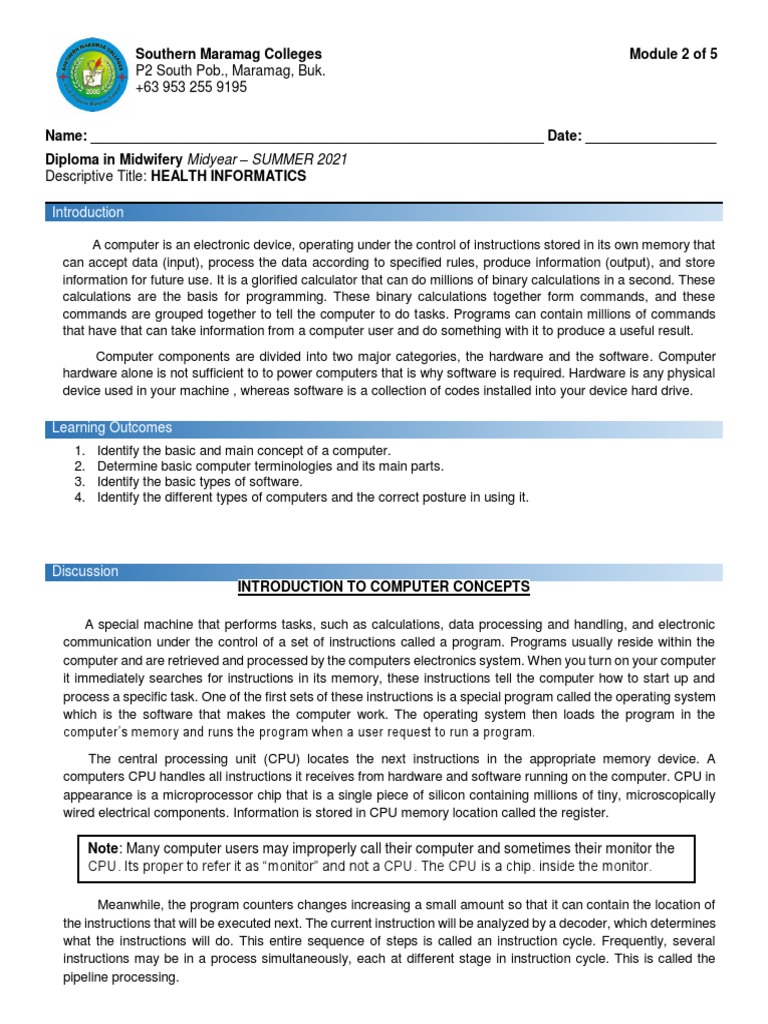 NAME ______________________________________________ HEALTH INFORMATICS Module 1 of 5