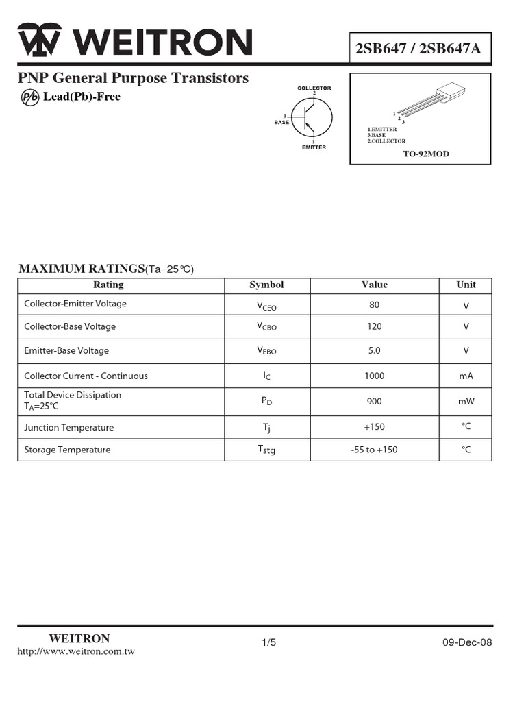 Transition frequency fT VCE=-5V, IC= -150mA 140 - MHz