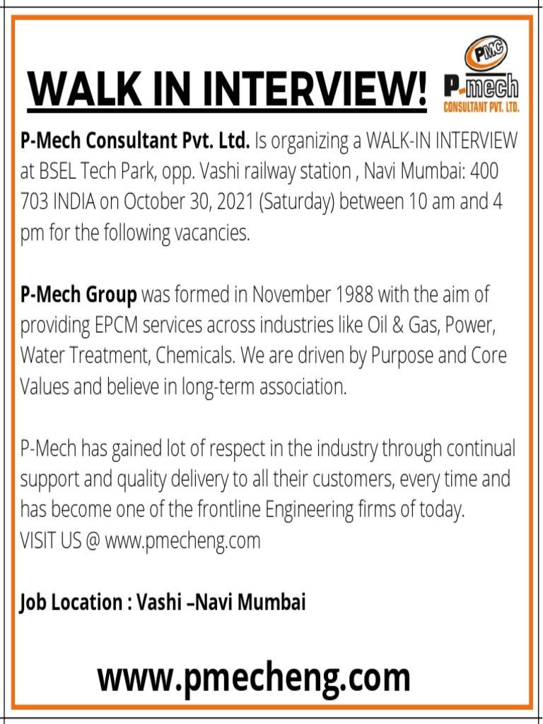 P-Mech Consultant Pvt. Ltd. Is organizing a WALK-IN INTERVIEW
