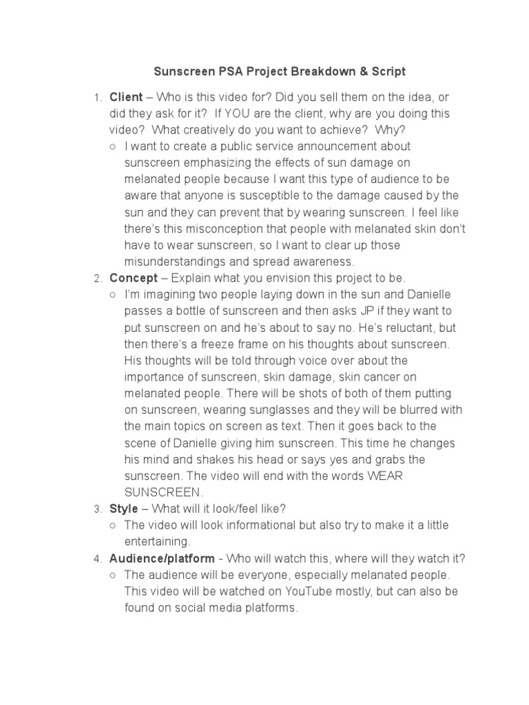 Sunscreen PSA Project Breakdown & Script