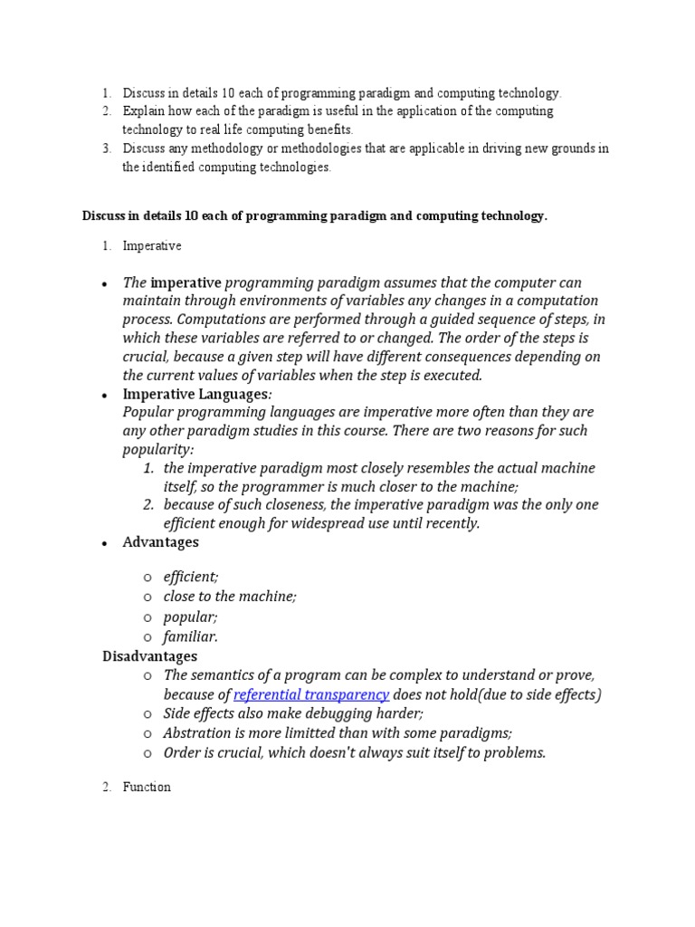 1. Discuss in details 10 each of programming paradigm and computing technology.