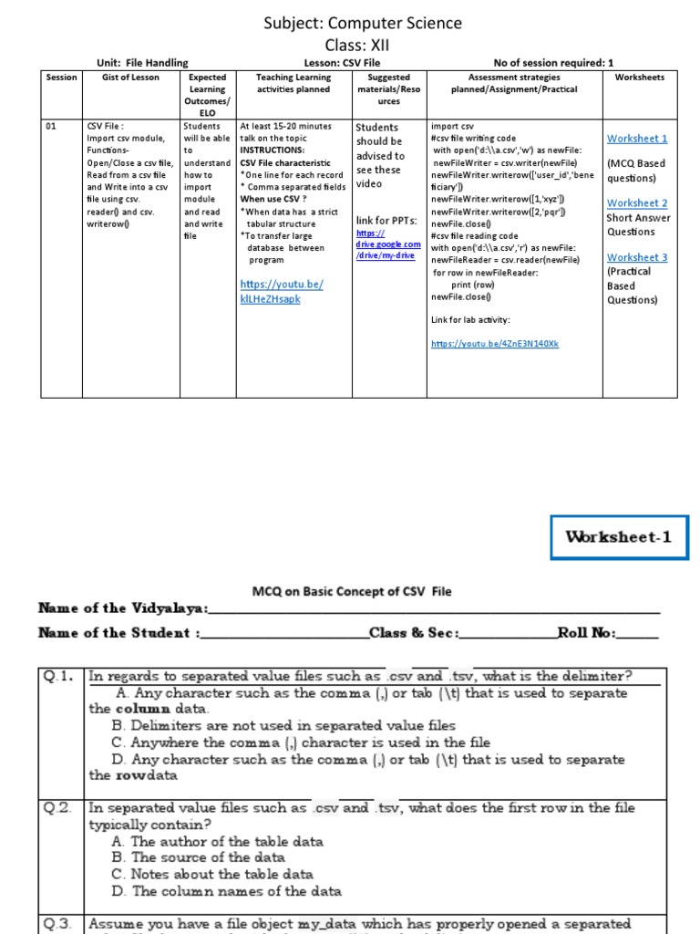 Unit: File Handling Lesson: CSV File No of session required: 1