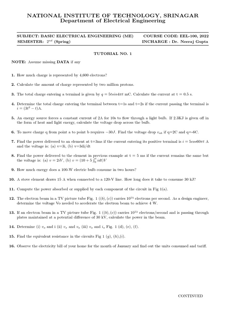 SUBJECT: BASIC ELECTRICAL ENGINEERING (ME) COURSE CODE: EEL-100, 2022