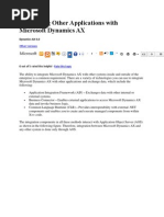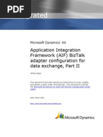 This document provides instructions to configure Application Integration Framework (AIF) for data exchange using the BizTalk adapter. The document also provides a brief overview of AIF. AIF enables companies to integrate Microsoft Dynamics AX and communicate with external business processes and partners through the exchange of XML over various transport media. AIF enables both business-to-business and application-to-application integration scenarios. AIF provides a programming model, tools, and infrastructure support for XML-based integration of application functionality and data with Microsoft Dynamics AX. AIF enables Microsoft Dynamics AX to expose its functionality via services and documents based on the Windows Communication Foundation (WCF). AIF also enables Microsoft Dynamics AX to consume functionality exposed by external applications through Web services.