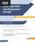i222, 9:33 M PDF js viewer ORACLE academy oracle.com Academy Java Foundations — Course Objectives Overview This course of study engages students with litte programming experience. Students are introduced to object-oriented concepts, terminology, and syntax, and the steps required to create basic Java programs using hands-on, engaging activities, Students will learn the concepts of Java programming, design object-oriented applications with Java and create Java programs using hands-on, engaging activities. This course prepares students for the Oracle Java Certfied Foundations Exam (120-811) Available Curriculum Languages: ‘+ Arabic, Simplfiod Chinese, English, French, Indonesian, Japanese, Brazilian Portuguese, Russian, Spanish Duration ‘© Recommended total course time: 80 hours* ‘© Professional education credit hours for educators who complate Oracle Academy training: 30 “Course time inludos instruction salf-studynomework, practices, projects and assessment Target Audiences Educators ‘© Technical, vocational, and 2- and 4-year college and university facuity members who teach computer programming, information communications technology (ICT), ora related subject at a foundational level ‘+ Secondary and vocational schoolteachers wha teach computer programming, Students ‘© Students who wish leam Java programming and build thelr Object-Oriented Programming experience using Java. ‘+ This course is a suitable foundational class for computer science majors, and when taught in sequence with Java Programming may be used to prepare studants for the AP Computar Science A oxam. Prerequisites Suggested ‘© Oracle Academy Workshop - Gotting Started with Java Using Alice ‘© Oracle Acadamy Workshop - Creating Java Programs with Greanfoot ‘© Oracle Academy Course - Java Fundamentals Suggested Next Courses ‘+ Oracle Acadomy Course - Java Programming opin 202 Orc ent ces Cad Jovn, nd NySOL ao seeed aden ct Cec andre ae, iar ames ay beaten of Drege nae hitpssimyacedemy.orace.comiplayerplay7ir_sessionid$5510J008449154J&classroom i 11661868in_Ip_1d°68697891 15i222, 9:33 M PDF js viewer Lesson-by-Lesson Topics and Objectives ‘Section 1 — Introduction 4-4 About the Course © Identify course goals and objectives © Understand the course environment ‘2 Describe the course learning strategy 4-2.A Brief History ‘Show examples of how people interact with Java in their daily lives ‘Summariza the history of Java Understand Java technology product groups ting up Java, Understand the difference between the JOK and JRE Understand the diference between java and class fies Dascrite the purpose of an intagrated development environment (IDE) ‘Add an existing Java file into a Java project 13 occef ooo Section 2 — Java Software Development 2:1 The Software Development Process Understand the Spiral Model of development Recognize tasks and subtasks of the Spiral Mode! Recognize what happens when stops are ignorad Identify sofware features Understand how features are gradually implemented at is my Program Doing? Understand how Java is read line by line ‘Set and use breakpoints End statemants with semicolons (:) ‘Organiza code using whitespace and othar conventions ‘Create comments 22 000008 co000 23 Introduction to Objoct-Oriantod Programming Goncapts ‘© _ Differentiate between procedural and object-oriented programming © Understand a class as a blueprint for an object © Understand a class is used to craate instances af an abject © Model objects as a combination of = Proportias (data fields) Behaviors (methods) Section 3 — Java Data Types 3-4 What is a Variable? © Understand the benefits of variables. (© Identity four main types of variables: + (boolean, int, double, Sting) © Declare and assign values to variables © Name variables according to conventions 3-2 Numeric Data 2 Differentiate intager data types (oyte, shor, int, long) © Differentiate floating point data types (float, double) © Manipulate and do math with numeric data 2 Use parentheses and order of operations 3-3 Textual Data Use the char data type Use Strings Concatenate Strings Understand escape sequences Understand print statements better Capi 202 Crack onder nes Cac Jv, re MySOL ae rere kaon cl Cn aris fin ther ames ye ade of epee ome hitpssimyacedemy.orace.comiplayerplay7ir_sessionid$5510J008449154J&classroom i 11661868in_Ip_1d°68697891i222, 9:33 M PDF js viewer ‘3-4 Converting Between Data Types Take advantage of automatic promotion And when to be cautious with promotions © Cast variables to other data types ‘= And when to be cautious with casting 2 Parse Strings as numeric values 3-5 Keyboard Input © Understand user input © Greate a JOptionPane to callect user input 2 Use a Scanner to collect input from the console 2 Use a Scanner to collect input from a fle © Understand how a Scanner handles tokens and delimiters Section 4 — Java Methods and Library Classes 4-1 What js @ Method? ‘Svucture code within a class Instantiato an object Understand the benefits of methods Use the dot operator (,) to access an objoct's fields and methods ‘Supply arguments to a method Return values from a method 1 import Declaration and Packages ‘Acoass a class by using its fully qualifiad name Describe the function of the import statement Uso the import statoment to access a ciass in a package Understand the purpose of an asterisk in an import statement Identify packages that are automatically imported 2 String Class Local the String class in the Java API documentation Understand the methods of the String class ‘Compare two String abjacts lexicagraphically Find the location of a substring in a Sting object, Extract a substring from a Sting object, ye Random Class Describe the purpose and uses of random numbers in Java programming Identify mothads of the Random class that obtain random numbers ‘Obtain random numbers in a ranga of numbers Understand the purpose of the random number seed e Math Class Unde