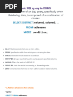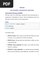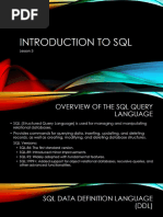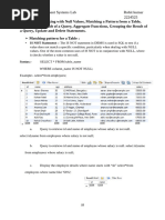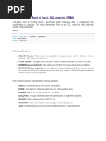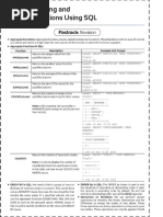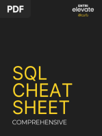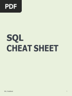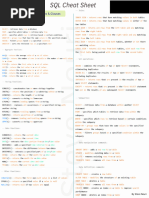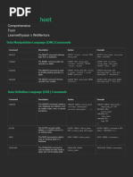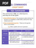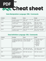 SQL COMMANDS CHEAT SHEET SQL Commands The commands in SQL are called Queries and they are of two types: s Data Definition Query: The statements which defines the structure of a database, create tables, specify their keys, indexes and soon * Data manipulation queries: : These are the queries which can be edited. — E.g: Select, update and insert operation Command el ALTER TABLE table_name It is used to add columns to Geleieesem § ADD column_name datatype; | a table in a database SELECT column_namels) It is an aperator that is used FROM table_name to combine two conditions WHERE eolumn_t = value_1 AND column_2 = value_2; SELECT column_name AS ROM table_namCommand ae COUNT fed Iria GROUP BY HAVING SELECT column_name(s) FROM table_name WHERE column_name BETWEEN value_1 AND value_2; SELECT column_name, CASE WHEN condition THEN 'Result_1' WHEN condition THEN 'Resuit_2° ELSE ‘Result_3° END FROM table_name; SELECT COUNT (column_name) FROM table_name; CREATE TABLE table_name ( column_1 datatype, column_2 datatype, column_3 datatype Xi SELECT column_name, COUNT (*) FROM table_name GROUP BY column_name; SELECT column_name, COUNT (*) FROM table_name GROUP BY column_name HAVING COUNT(*) > value; It ls an operator used to filter the result within a certain range It is a statement used to create different outputs inside a SELECT statement It is a function that takes the name of a column as argument and counts the number of rows when the column is not NULL it is used to create a new table in a database and specify the name of the table and columns inside it Its an clause in SQL used for aggregate functions in collaboration with the SELECT statement it is used in SQL because the WHERE keyword cannot be used in aggregating functionsTn sce eli INSERT 1S NULLS IS NOT NULL SELECT column_name(s) FROM table_1 JOIN table_2 ON table_1.column_name = table_?.column_name; INSERT INTO table_name (column_1, column_2, column _3) VALUES (value_1, ‘value_2', value_3); SELECT column_name(s) FROM table_name WHERE column_name IS NULL; SELECT column_name(s) FROM table_name WHERE column_name LIKE pattern; SELECT column_name(s) FROM table_name LIMIT number; SELECT MAX(column_name) FROM table_name; SELECT MIN(column_name) FROM table_name; [ida] eld It is used to combine rows from different tables if the Jain condition goes TRUE It is used to add new rows to a table lt is a operator used with the WHERE clause to check for the empty values It is an special operator used with the WHERE clause to search for a specific pattern ina column itis a clause to specify the maximum number of rows the result set must have It is a function that takes number of columns as an argument and return the largest value among them It is a function that takes number of columns as an argument and return the smallest value among, themfel eis ac) e pees ale) SELECT DISTINCT SELECT column_name FROM table_name WHERE column_name = value _1 OR column_name = value_ SELECT column_name FROM table_name ORDER BY column_name ASC | DESC; SELECT column_name(s) FROM table_1 LEFT JOIN table_2 ON table_1.column_name = table_2.columm_name: SELECT ROUND(column_ name,integer) FROM table_name; SELECT DISTINCT column_ name FROM table_name; SELECT SUM(column_name) FROM table_name; it is an operator that is used to filter the result set to contain only the rows where either condition is TRUE itis a clause used to sort the result set by a particular column either numerically or alphabetically It is sued to combine rows from different tables even if the condition is NOT TRUE It is a function that takes the column name and a integer as an argument, and rounds the values ina column to the number of decimal places specified by an integer It is a statement that is used to fetch data froma database itis used to specify that the statement is a query which returns unique values in specified columns It is function used to return sum of values from a particular columnUPDATE table_name It is used to edit rows ina SET some_column = some_ table value WHERE some_column = some_value; UPDATE SELECT column_namet(s) It is a clause used to filter FROM table_name the result set to include WHERE column_name the rows which where the operator value; condition is TRUE WITH temporary_name AS ( It Is used to store the result SELECT * of a particular query in a FROM table_name) temporary table using an SELECT * alias FROM temporary_name WHERE column_name operato| value; DELETE FROM table_name it is used to remove the WHERE some_column = rows from a table some_value; SELECT AVG(column_name) It is used to aggregate a FROM table_name; numeric column and return its average EE es ne ace Ms uy UE eum erate tier Cee Rael Coenen Mc aes SELECT cl, c2 Saale aol ing FROM t1 INNER JOIN t2 on condition To select the data in Column ct Select column c1 and c2 from table from table t t1 and perform an inner join between tl and t2eA eich e cig UDP ee as-is 4 Cease aioe eae) Cer Oe eme ls SELECT cl, c2 ese eae] ed FROM tl LEFT JOIN t2 on condition eee eeu el ued Select column ¢1 and c2 from table from table t t1 and perform a left join between t1 and t2 SELECT cl, c2 FROM tl RIGHT JOIN t2 on condition Select column ci and c2 from table t1 and perform a right join between t1 and t2 kaa a OL eg Ral. ct CR ag ie eel ei RT Sas aa 10S a a8) a SELECT cl, c2 FROM tl ORDER BY cl ASC (DESC) FULL OUTER JOIN 2 on condition Br eee eee Select column cl and c2 from table pe eect Lats tl and perform a full outer join Cer ce between t! and t2 SELECT c1 FROM t SELECT ct, c2 FROM tI ele] t a-ha nel a CROSS JOIN t2 offset Select column c1 and c2 from table BC Rae a ee ee ial | t1 and produce a Cartesian product Gee auc of rows in a table SELECT c1, aggregate(c2) eres SELECT cl, c2 FROM t1, t2 Select column c1 and ¢2 from table t1 and produce a Cartesian product of rows in a table GROUP BY c1 PCP eee eae etd MetPTE ee Ch ale PU elt ic mlm ie ald Cre emcee MeL Pee eit Me Ll SELECT c1, aggregate(c2) SELECT cl, c2 FROMt FROM t1 A fe 