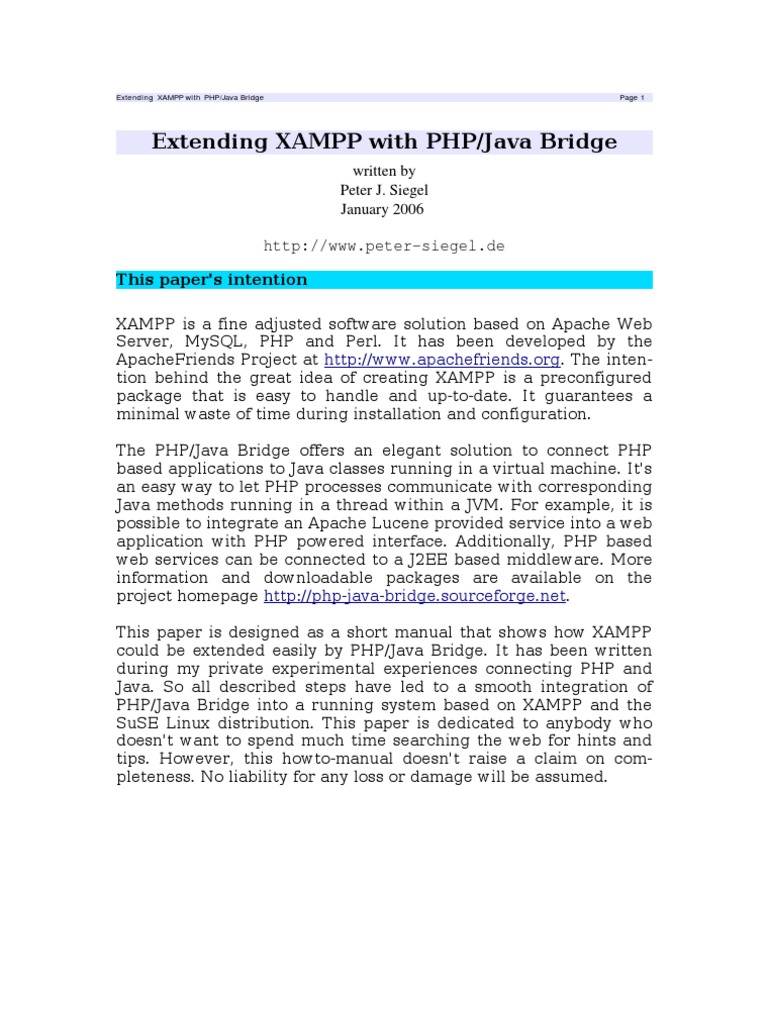 writtenby PeterJ.Siegel January2006 http://www.peter-siegel.de This paper's intention XAMPP is a fine adjusted software solution based on Apache Web Server, MySQL, PHP and Perl. It has been developed by the ApacheFriends Project at http://www.apachefriends.org. The intention behind the great idea of creating XAMPP is a preconfigured package that is easy to handle and up-to-date. It guarantees a minimal waste of time during installation and configuration. The PHP/Java Bridge offers an elegant solution to connect PHP based applications to Java classes running in a virtual machine. It's an easy way to let PHP processes communicate with corresponding Java methods running in a thread within a JVM. For example, it is possible to integrate an Apache Lucene provided service into a web application with PHP powered interface. Additionally, PHP based web services can be connected to a J2EE based middleware. More information and downloadable packages are available on the project homepage http://php-java-bridge.sourceforge.net. This paper is designed as a short manual that shows how XAMPP could be extended easily by PHP/Java Bridge. It has been written during my private experimental experiences connecting PHP and Java. So all described steps have led to a smooth integration of PHP/Java Bridge into a running system based on XAMPP and the SuSE Linux distribution. This paper is dedicated to anybody who doesn't want to spend much time searching the web for hints and tips. However, this howto-manual doesn't raise a claim on completeness. No liability for any loss or damage will be assumed.