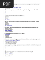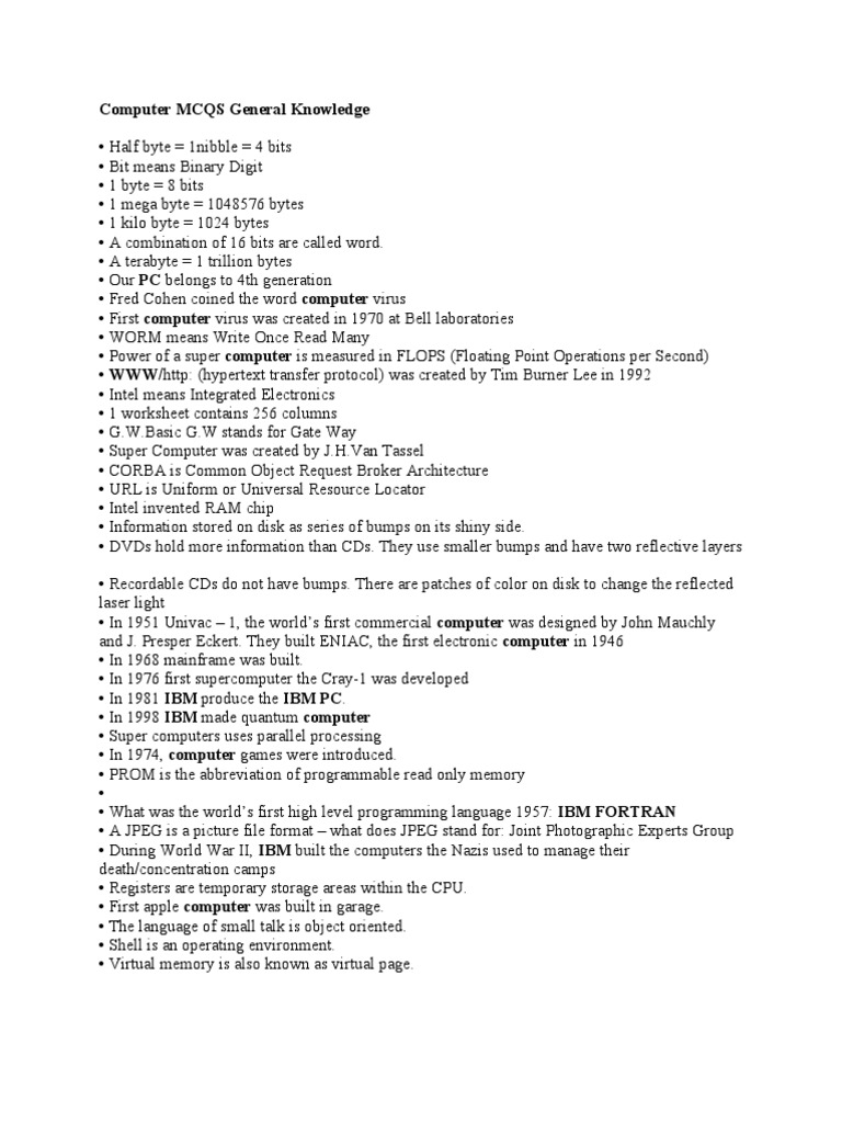 mega byte = 1048576 bytes 1 kilo byte = 1024 bytes A combination of 16 bits are called word. A terabyte = 1 trillion bytes Our PC belongs to 4th generation Fred Cohen coined the word computer virus First computer virus was created in 1970 at Bell laboratories WORM means Write Once Read Many Power of a super computer is measured in FLOPS (Floating Point Operations per Second) WWW/http: (hypertext transfer protocol) was created by Tim Burner Lee in 1992 Intel means Integrated Electronics 1 worksheet contains 256 columns G.W.Basic G.W stands for Gate Way Super Computer was created by J.H.Van Tassel CORBA is Common Object Request Broker Architecture URL is Uniform or Universal Resource Locator Intel invented RAM chip Information stored on disk as series of bumps on its shiny side. DVDs hold more information than CDs. They use smaller bumps and have two reflective layers Recordable CDs do not have bumps. There are patches of color on disk to change the reflected laser light In 1951 Univac 1, the worlds first commercial computer was designed by John Mauchly and J. Presper Eckert. They built ENIAC, the first electronic computer in 1946 In 1968 mainframe was built. In 1976 first supercomputer the Cray-1 was developed In 1981 IBM produce the IBM PC. In 1998 IBM made quantum computer Super computers uses parallel processing In 1974, computer games were introduced. PROM is the abbreviation of programmable read only memory What was the worlds first high level programming language 1957: IBM FORTRAN A JPEG is a picture file format what does JPEG stand for: Joint Photographic Experts Group During World War II, IBM built the computers the Nazis used to manage their death/concentration camps Registers are temporary storage areas within the CPU. First apple computer was built in garage. The language of small talk is object oriented. Shell is an operating environment. Virtual memory is also known as virtual page.