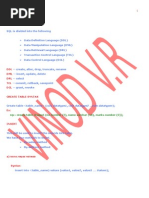 SQL is divided into the following 1Data Definition Language (DDL) 2Data Manipulation Language (DML) 3Data Retrieval Language (DRL) 4Transaction Control Language (TCL) 5Data Control Language (DCL) DDL -- create, alter, drop, truncate, rename DML -- insert, update, delete DRL -- select TCL -- commit, rollback, savepoint DCL -- grant, revoke CREATE TABLE SYNTAX Create table <table_name> (col1 datatype1, col2 datatype2 coln datatypen); Ex: SQL> create table student (no number (2), name varchar (10), marks number (3)); INSERT This will be used to insert the records into table. We have two methods to insert. 1By value method 2By address method a)