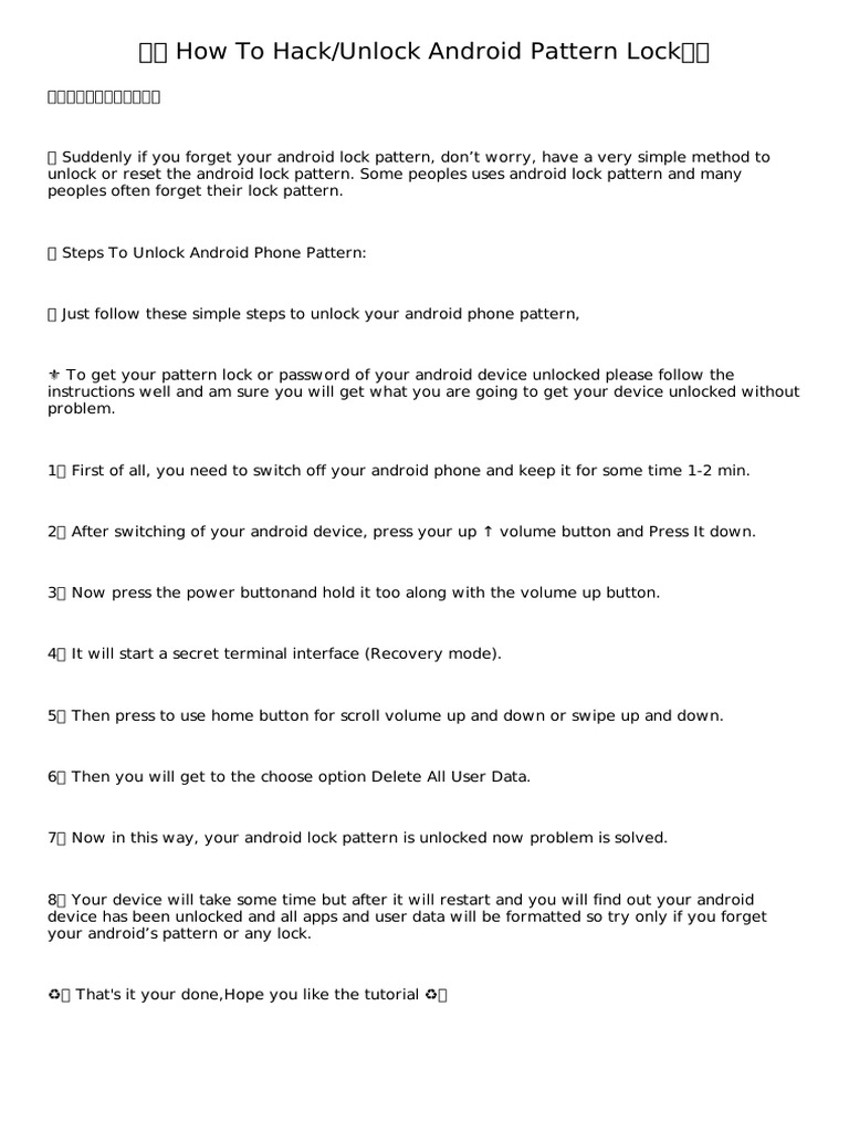 This document provides steps to unlock an Android device pattern lock if it is forgotten. The steps involve turning the device off, pressing volume up and power buttons during startup to access recovery mode, then selecting the "Delete All User Data" option which will reset the pattern lock by deleting all user data from the device. Once restarted, the device will be unlocked without needing the forgotten pattern.