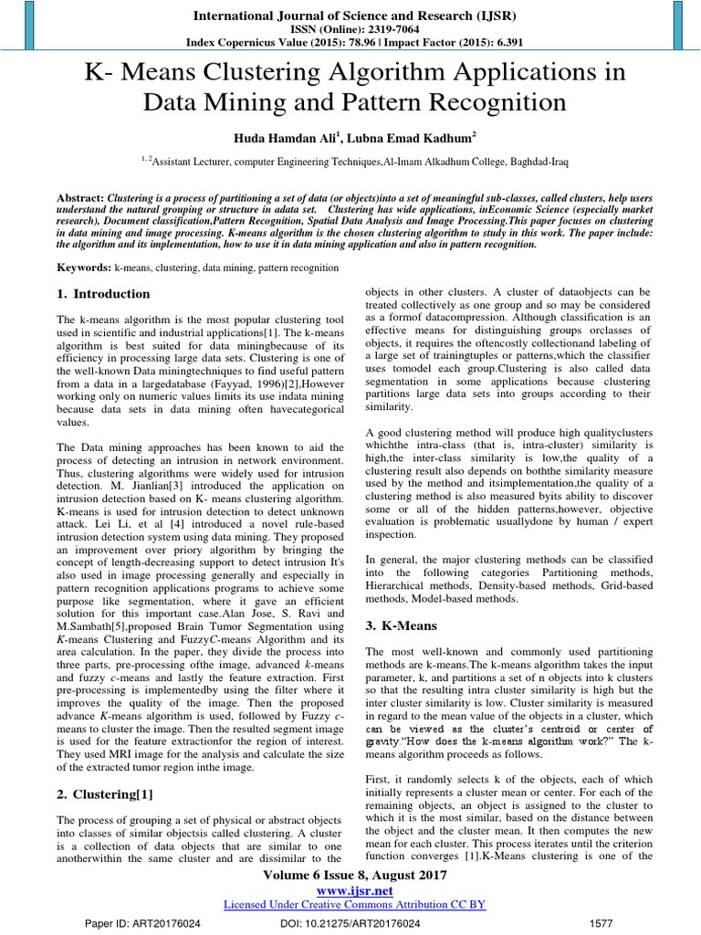 Keywords: k-means, clustering, data mining, pattern recognition
