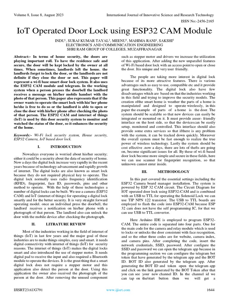 number of digital locks can be built. We use a camera (ESP32 IOT operated door lock using ESP32-CAM and is combined