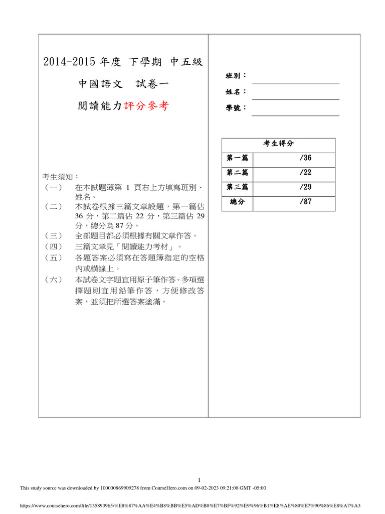 (一) 在本試題簿第 1 頁右上方填寫班別、 第三篇 /29