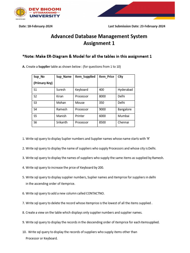 A. Create a Supplier table as shown below : (for questions from 1 to 10)