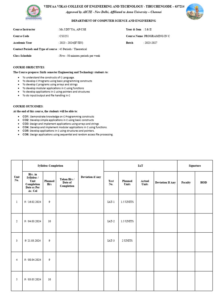 Unit Periods Topics to be Covered Actual Date COs Page No.