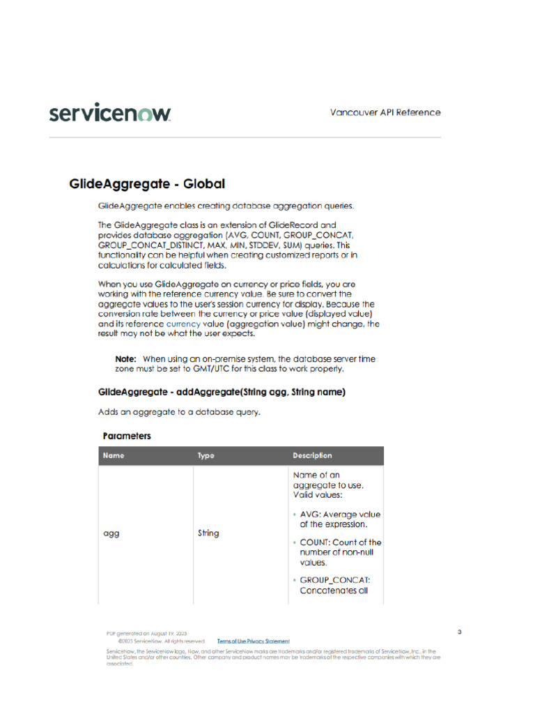 servicenow Voncouver API Reference GlideAggregate - Global Glide aggregate enables creating datahare aggregation queries. ‘The GideAggregate classis an extension of GlideRecord and provides database aggregation (AVG, COUNT, GROUP_CONCAT, GROUP_CONCAT DISTINCT, MAX, MIN, STDDEV, SUM) queries. This functionaity con be helpful when creating customized reports or in ‘cakuiations for calculated fields. When you use GideAggregate on currency or price fields, you ore ‘working with the reference currency value. Be sure to convert the ‘aggregate values to the user's session currency for display. Because the conversion rate between the currency or price value (displayed value) andits reference currency valve (aggregation value) might change, the result may not be what the user exoects. Note: when using cn on-premise system, the database server time zone must be set fo GMI/UTC for this class to work properly. GlideAggregate - addAggregate(string agg, String name) Adds an aggregate to a database query. Name of an ‘aggregate 10 use. Valid valves: © AVG: Average value of the expression. + COUNT: Count of the number of non-null values. * GROUP_CONCAT: ‘Concatenates allservicenow Vancouver API Reference ra oa 3 ‘nor-null values of the group in ‘ascending order. joins them with o ‘comma ('"), and rotums tho result os 0 String, GROUP_CONCAT_D! STINCT: Concatenaies all nor-null values of the group in ‘ascending order, removes dupicates. joins them with a. ‘comma ('"), and retums the result oso String. + MAX: Largest, or ‘maximum, value. + MIN: Minimum valve. « SIDDEY: Population slondard ceviation. © SUM: Sum of al values. ‘Optional. Nome of ‘he field to group ‘ne results of the fame Sting aggregation by. Default: Nullservicenow. Vancouver API Reference Returns Typ void Example The following example shows how to use GlideAagregate functions on the Incident [incident] table. (var incidentGA - new ClideAggregate(‘incident") incidentcn.groupBy ['category! incidentGa.orderByAggregate('COUNT", ‘sys_ned_count'): incidentca.addaggregate("AVG", ‘sys_nod_count'); incidentca.addaggregate("COUNT', ‘eys_ned_count! AncidentGA.adaggregate("GROUP_CONCAT?, 'sys_mod_count") incidentGA.addAggregate("GROUP_CONCAT_DISTINCT*, sys_mod_ lcount") 5 incidentGAa.addAggregate("MAX', ‘sys_nod_count'); incidentcA.addaggregate(*MIN', ‘sys_mod_count'); AncidentGR addAggregate("STDDEV', 'Sys_Rod_count'); incidentGa.addAggregate("SUM', ‘sys_nod_count'): incident@a.query(); Jsnile (incidentGa.next()) { igs info(!CATEGORY: ' + incidentGR.gatValue ("category"): (as.inro(‘AVG: * + incidentGA.getAgaregate (‘AVG', 'sys_med_ (couat')) (go into { 'Couw: ‘mod_count")) (98. Tnfo('GROUP_CONCRT: ' + incidentGA.getAggregate | 'GROUP_ |concar’, ‘sys_moa_count')); igs. info ("GROUP _colicaT DISTINCT: * + incidentGA.getaggregat le(*GROUP_CONCAT DISTINCT", 'sys_mod_count')); ige-info(TMAX: ' + incidentcA.getaggregate ("MAX", 'eys_nod_ lcount')) (gs. info('MIN: ' + incidentGA.getAggregate('MIN', ‘sys_mcd_ (count ')) \go- info { *STDDEV: 's_sod_count") | 4 dncidentea.getaggregate ("COUNT!, ‘oyo_ * + dncidentGa.getaggregate (‘STDDEV', ‘sy,servicenow. Vancouver API Reference las-inro( ‘sum: * + incidentGA.getagaregate (‘SUM', ‘sys_mod_ (couat')) \go-info(" * 2 Output. (CATEGORY: inquiry lave: 8.42424242424242424242424242424242424242E00 (cour: 33 (GROUP_CONCAT: 0, 0, 0,.0/2,2,2)4y 4, 4,5, 5,51 67616, 6, 8, 6, 6, 67 9,15, 15,19, 52,33, 36 + 0,1, 2,4,5,6,7,B, 9,15,19, 32, 33,36 IMnn: 0 leropey: 9.15843294125113629932710147135171494439200 ‘sum: 278 (CATEGORY: software lave: 22 \couur: 13 (GROUP_CONCAT: 3, 4,5,5,6,7,9,10,10,11,14, 94,95 \GROUP_CONCAT DISTINCT: 3,4,5,6,7,9,10,11,14,94, 95 wax: 95 lMnN: 3 \sropev: 3.27693962918655755532970326989852794087501 ‘sum: 273 (cArEGORY: Hardware lave: 6.8 (cour: 10 (GROUP_CONCAT: 2, 5,5, 6,6,6,7,7,9,15 (GROUP_CONCAT_DISTINCT: 2,5, 6,7,8,15 \vax: Ts Man: 2 ‘sropev: 3.39280283999985933622620108982884699755200 ‘sum: 68 (CATEGORY: network lave: 16 (cour: 5 (GROUP_CONCAT: 3, 12,17,21, 37 (GROUP_CONCAT DISTINCT: 3,12,17,21,37servicenow. Vancouver API Reference (Group _coNcaT: 8, 8, 20,12 \GRoUPLcoNcaT_prstinct: 8,10,12 1, 91495421551267621995020382273964310607200 (CATEGORY: database lave: 29 2,50 IceouP_concan orsemucr: @, 50 bax: 30 an: 8 lsroDev: 2.96984e4e0se3499c024835463209403¢5965501 Isom: se Scoped equivalent To use the addagaregate|) method in a scoped application, use the corresponding scoped method: . GlideAggregate - addEncodedQuery(String query) ‘Adds an encoded avery tothe other queries thal may have been set for ‘his aggregate. Parameters Encoded query sting auery sting to.add to the aggregate,servicenow. Vancouver API Reference (var agg = new GlideAggregate( incident’); lag. addaogregate( ‘count’, "category") : lagg.orderByAggregate ("count', ‘category’ lag. orderBy ("category") 'agg.addQvery(*opened_at', '>=', ‘Javascript:gs.monthsAgost larcez)"); lagg-addgvery(*opened at", "<= lac2)) lagg.query(): Wwhile (agg.next (I) var category = aqg.categozy: var count = agg.getAggregate (*count', ‘cetegory") ; var query ~ agg.getQuery() var agg2 = naw Glidedggregate ("incident '); agg? .addAggregate ("count", 'category") agg2 orcersyaggrecate(*count', *category'): agg? .oxcerBy ("category"): agg? adcQuery ("opened at', '>=', 'Javascript:gs.nonthehg loseare(3)") ‘agg? .adcQvery ('opened_at', ‘< lozna(s)* ‘agg? -adcEncodeaguery (query) + agg? query ( var last while (agg2-next (0) ¢ last = agg2.getaggregate( ‘count’, ‘category') “Javascript:gs.moathsAgcEn d gs.log(categozy + ": Last month: lonth:" + last! + count +" Previous Mservicenow Voncouver API Reference Scoped equivalent To use the addEncodedQuery() method in a scoped application, use the corresponding scoped method: . GlideAggregate - addHaving(String name, String operator, String value) ‘Adds a "having" element to the aggregate, such as select category, cou