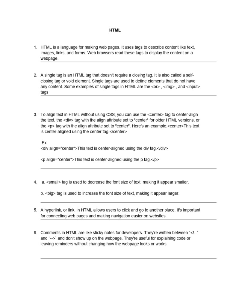 1. HTML is a language for making web pages. It uses tags to describe content like text,