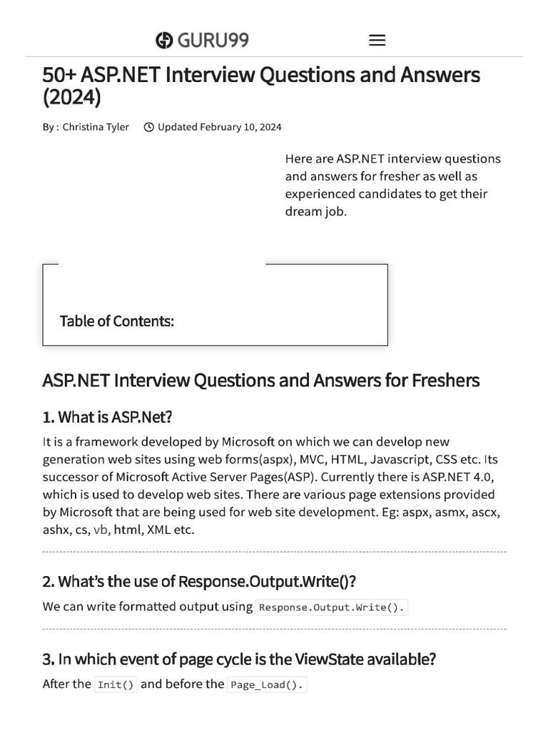 @ GURU99 = 50+ ASP.NET Interview Questions and Answers (2024) By: Christina Tyler @ Updated February 10, 2024 Here are ASP.NET interview questions and answers for fresher as well as experienced candidates to get their dream job. Table of Contents: ASP.NET Interview Questions and Answers for Freshers 1, What is ASP.Net? It is a framework developed by Microsoft on which we can develop new generation web sites using web forms(aspx), MVC, HTML, Javascript, CSS etc. Its successor of Microsoft Active Server Pages(ASP). Currently there is ASP.NET 4.0, which is used to develop web sites. There are various page extensions provided by Microsoft that are being used for web site development. Eg: aspx, asmx, ascx, ashx, cs, vb, html, XML etc. 2. What’s the use of Response.Output.Write()? We can write formatted output using Response.Output .Write(). 3, In which event of page cycle is the ViewState available? After the Init() and before the page_Load().EXPLORE MORE Learn Java Programming with Beginners Tutorial Linux Tutorial for Beginners: Introduction 4. What is the difference between Server.Transfer and Response.Redirect? In Server.Transfer page processing transfers from one page to the other page without making a round-trip back to the client’s browser. This provides a faster response with a little less overhead on the server. The clients url history list or current url Server does not update in case of Server.Transfer. Response.Redirect is used to redirect the user’s browser to another page or site. It performs trip back to the client where the client’s browser is redirected to the new page. The user’s browser history list is updated to reflect the new address. 5. Fram which base class all Web Forms are inherited? Page class. 6. What are the different validators in ASP.NET? The following are different validators in ASP.NET 1. Required field Validator 2. Range Validator 3. Compare Validator 4. Custom Validator 5. Regular expression Validator 6. Summary Validator7. Which validator control you use if you need to make sure the values in two different controls matched? Compare Validator control. 8. What is ViewState? ViewState is used to retain the state of server-side objects between page post backs. 9, Where the viewstate is stored after the page postback? ViewState is stored in a hidden field on the page at client side. ViewState is transported to the client and back to the server, and is not stored on the server or any other external source. ASP.NET Interview Questions and Answers for 3 Years Experience 10. How long the items in ViewState exists? They exist for the life of the current page. 11. What are the different Session state management options available in ASP.NET? 1. In-Process 2. Out-of-Process. In-Process stores the session in memory on the web server. Out-of-Process Session state management stores data in an external server. The external server may be either a SQL Server or a State Server. All objects stored in session are required to be serializable for Out-of-Process state management.12. How you can add an event handler? Using the Attributes property of server side control. eg. btnSubmit Attributes .Add("onMouseOver", "JavascriptCode();") 13. What is caching? Caching is a technique used to increase performance by keeping frequently accessed data or files in memory. The request for a cached file/data will be accessed from cache instead of actual location of that file. 14. What are the different types of caching? ASP.NET has 3 kinds of caching: 1. Output Caching, 2. Fragment Caching, 3. Data Caching. 15. Which type if caching will be used if we want to cache the portion of a page instead of whole page? Fragment Caching: It caches the portion of the page generated by the request. For that, we can create user controls with the below code: