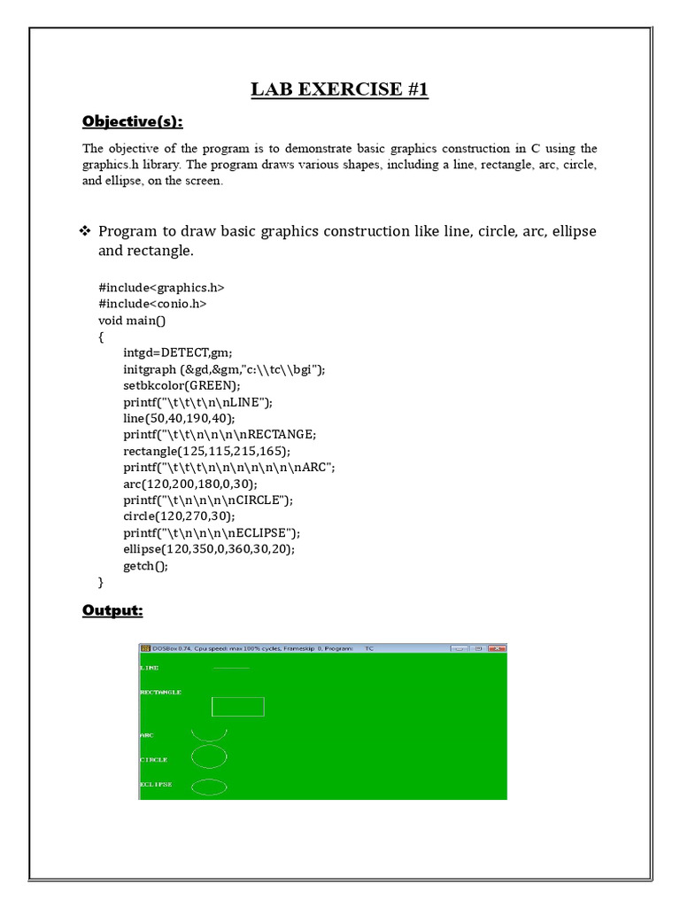 graphics.h library. The program draws various shapes, including a line, rectangle, arc, circle,