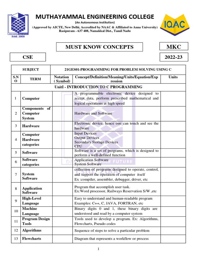 SUBJECT 21GES01-PROGRAMMING FOR PROBLEM SOLVING USING C