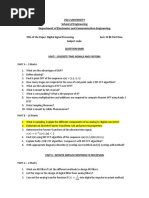 UNIT-III: EFFECTS OF FINITE WORD LENGTH TWO MARKS: 1. What are the effects of finite word length in digital filters? 2. List the errors which arise due to quantization process. 3. Discuss the truncation error in quantization process. 4. Write expression for variance of round-off quantization noise. 5. What is sampling? 6. Define limit cycle Oscillations, and list out the types. 7. When zero limit cycle oscillation and Over flow limit cycle oscillation has occur? 8. Why? Scaling is important in Finite word length effect. 9. What are the differences between Fixed and Binary floating point number representation? 10. What is the error range for Truncation and round-off process? PART B 1. The output of an A/D is fed through a digital system whose system function is H(Z)=(1-_)z /(z-_), 0<_<1.Find the output noise power of the digital system. (8) 2. The output of an A/D is fed through a digital system whose system function is H(Z)=0.6z/z-0.6. Find the output noise power of the digital system=8 bits (8) 3. Discuss in detail about quantization effect in ADC of signals. Derive the expression for Pe(n) and SNR. (16) 4 a. Write short notes on limit cycle oscillation (8) b. Explain in detail about signal scaling (8) 5. A digital system is characterized by the difference equation Y(n)=0.95y(n-1)+x(n).determine the dead band of the system when x(n)=0 and y(-1)=13. (16) 6. Two first order filters are connected in cascaded whose system functions of theIndividual sections are H1(z)=1/(1-0.8z- ) and H2(z)=1/(1-0.9z ).Determine the Over all output noise power. (16) UNIT-IV: POWER SPECTRUM ESTIMATION TWO MARKS 1. What is the need for spectral estimation? 2. How can the energy density spectrum be determined? 3. What is autocorrelation function? 4. What is the relationship between autocorrelation and spectral density? 5. Give the estimate of autocorrelation function and power density for random signals? 6. Obtain the expression for mean and variance for the autocorrelation function of random signals.