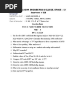 UNIT 1 SIGNALS AND SYSTEMS TWO MARKS: 1. Define about DFT and IDFT? 2. Find the values of WNk ,When N=8, k=2 and also for k=3. 3. Compare DIT radix-2 FFT and DIF radix -2 FFT. 4. Draw the radix-2 FFTDIF butterfly diagram. 5. Draw the radix-2 FFTDIT butterfly diagram. 6. What is the necessity of sectioned convolution in signal processing? 7. Define Correlation of the sequence. 8. State any two DFT properties. 9. Why impulse invariant transformation is not a one-to-one mapping? PART B 1. a) Compute 4- point DFT of casual three sample sequence is given by, x(n) = 1/3, 0_n_2 = 0, else (10) b) State and prove shifting property of DFT. (6) 2. Derive and draw the radix -2 DIT algorithms for FFT of 8 points. (16) 3. Compute the DFT for the sequence {1, 2, 0, 0, 0, 2, 1, 1}. Using radix -2 DIF FFT and radix -2 DITFFT algorithm. (16) 4. Find the output y(n) of a filter whose impulse response is h(n) = {1, 1, 1} and input signal x(n) = {3, -1, 0, 1, 3, 2, 0, 1, 2, 1}. Using Overlap add overlap save method. (16) 5. In an LTI system the input x(n) = {1, 1, 1}and the impulse response h(n) = {-1, -}Determine the response of LTI system by radix -2 DIT FFT (16) 6. Find the output y(n) of a filter whose impulse response is h(n) = {1, 1, 1} and input signal x(n) = {3, -1, 0, 1, 3, 2, 0, 1, 2, 1}. Using Overlap save method (16) UNIT-II: DIGITAL FILTERS DESIGN TWO MARKS: 1. Differentiate IIR filters and FIR filters. 2. Write the characteristics features of Hanning window