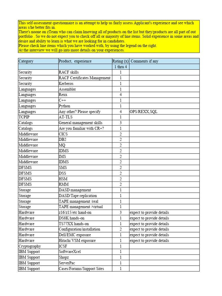 This self-assessment questionnaire is an attempt to help us fairly assess Applicant's experience and see which