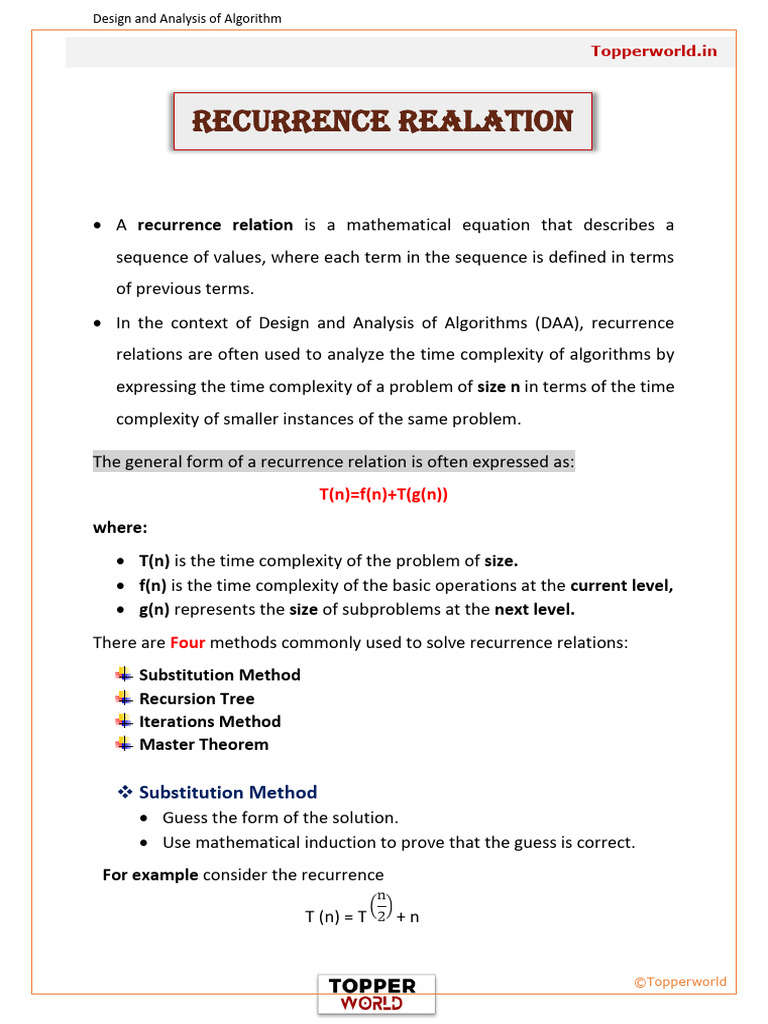 • In the context of Design and Analysis of Algorithms (DAA), recurrence
