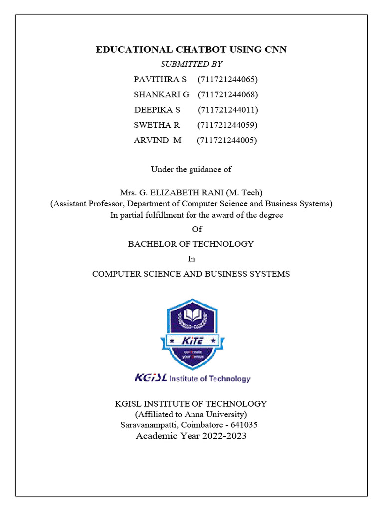 This is to certify that the Mini project titled “EDUCATIONAL CHATBOT