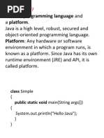 Java programming What is Java? Java is a programming language and a platform. Java is a high \evel, robust, object-oriented and secure programming language. Java was developed by Sun Microsystems (which is now the subsidiary of Oracle) in the year 1995. James Gosling is known as the father of Java. Platform: Any hardware or software environment in which a program runs, is known as a platform. Since Java has a runtime environment (JRE) and API, it is called a platform. Application 1. Desktop Applications such as acrobat reader, media player, antivirus, etc. . Web Applications such as irctc.co.in, javatpoint.com, etc. . Enterprise Applications such as banking applications. . Mobile . Embedded System . Smart Card . Robotics . Games, etc. ONONRWN Features of Java Simple Java is very easy to learn, and its syntax is simple, clean and easy to understand. According to Sun Microsystem, Java language is a simple programming language because: Java syntax is based on C++ (so easier for programmers to learn it aftero Java has removed many complicated and rarely-used featu 2/10 example, explicit pointers, operator overloading, etc. ‘ea There is no need to remove unreferenced objects because there is an Automatic Garbage Collection in Java. Object-oriented Java is an object-oriented programming language. Everything in Java is an object. Object-oriented means we organize our software as a combination of different types of objects that incorporate both data and behaviour. Platform Independent Class File “| Mac/OS windows Linux JvM VM IV 1 J df oth Java is platform independent because it is different from other languages like C, C++, etc. which are compiled into platform specific machines while Java is a write once, run anywhere language. A platform is the hardware or software environment in which a program runs. Secured Java is best known for its security. With Java, we can develop virus-free systems. Java is secured because: o No explicit pointer « Java Programs run inside a virtual machine sandbox Robust The English mining of Robust is strong. Java is robust because:o Ituses strong memory management. o There is a lack of pointers that avoids security problems. «Java provides automatic garbage collection which runs on the Java Virtual Machine to get rid of objects which are not being used by a Java application anymore. Architecture-natural Java is architecture natural because there are no implementation dependent features, for example, the size of primitive types is fixed. Portable Java is portable because it facilitates you to carry the Java bytecode to any platform. It doesn’t require any implementation. High-performance Java is faster than other traditional interpreted programming languages because Java bytecode is "close" to native code. Distributed Java is distributed because it facilitates users to create distributed applications in Java. Multi-threaded A thread is like a separate program, executing concurrently. We can write Java programs that deal with many tasks at once by defining multiple threads. Dynamic Java is a dynamic language. It supports the dynamic loading of classes. It means classes are loaded on demand. It also supports functions from its native languages, i.e., C and C++.First Java Program @ class keyword is used to declare a class in Java. public keyword is an access modifier that represents visibility. It means it is visible to all. static is a keyword. If we declare any method as static, it is known as the static method. The core advantage of the static method is that there is no need to create an object to invoke the static method. The main() method is executed by the JVM, so it doesn't require creating an object to invoke the main() method. So, it saves memory. void is the return type of the method. It means it doesn't return any value. o main represents the starting point of the program. o String[] args or String args[] is used for command line argument. > $ystem.out.printin() is used to print statement. Here, System is a class, out is an object of the PrintStream class, println() is a method of the PrintStream class. What happens at runtime? At runtime, the following steps are performed: C2 ees a Qa &)Q) Can you save a Java source file by another name than the class name? Yes, if the class is not Public. It is explained in the figure given below: case simple} eubtestatic void main(seang argst I} compiles System out pani Helo"): —* ertecode » ard ji: smple.aes Q) Can you have multiple classes in a java source file? Yes, like the figure given below illustrates: e- - &> - * = Djava Difference between JDK, JRE, and JVM JVM JVM (Java Virtual Machine) is an abstract machine. It is called a virtual machine because it doesn't physically exist. It is a specification that provides a runtime environmentJRE 10 JRE is an acronym for Java Runtime Environment. It is also written a a RTE. The Java Runtime Environment is a set of software tools which are used for developing Java applications. It is used to provide the runtime environment. JDK JDK is an acronym for Java Development Kit. The Java Development Kit (JDK) is a software development environment which is used to develop Java applications and applets. It physically exists. It contains JRE + development tools. Java Variables A variable is a container which holds the value while the Java program is executed. A variable is assigned with a data type. Variable is a name of memory location. There are three types of variables in java: local, instance and static. 1) Local Variable A variable declared inside the body of the method is called local variable. You can use this variable only within that method and the other methods in the class aren't even aware that the variable exists. A local variable cannot be defined with "static" keyword. 2) Instance Variable A variable declared inside the class but outside the body of the method, is called an instance variable. It is not declared as static. 3) Static variable A variable that is 