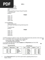 Que 1. Consider the following Employee table: Table Narre: Employee Feneyen.jempioys vere] sot_rie | sary [oon] a3 | ae President 50000 NULL 28 NULL 1205 Amyra Manager 30000 2500 26 1201 v2i0 Rahul Analyst 20000 150023 1205 ra13 Manish Salesman 15000 NULL 22 1205 1216 Megha ‘Analyst 22000130025 1201 1217 Mohit Salesman 16000 NULL 22 4205 The primary key of this table is Employee ID and Manager_ID is a foreign key that references Employee_ID. Write SQL commands for the following: (a) Create the above table Answer: CREATE TABLE Employee ( Employee_ID integer PRIMARY KEY, Employee_Name VARCHAR(30), Job_Title VARCHAR(25), Salary DECIMAL(10), Bonus INTEGER, Age INTEGER, Manager_ID INTEGER, FOREIGN KEY (Manager _ID) REFERENCES EMPLOYEE(EMPLOYEE ID) ys (b) Insert values as shown above. Answer: Inserting values in table Employee as given in the table- * INSERT INTO Employee VALUES(1201, DIVYA, ‘PRESIDENT’, 50000, NULL, 29, NULL); + INSERT INTO Employee VALUES(1205, ‘AMYRA,, ‘MANAGER’, 300000, 2500, 26, 1201 ); * INSERT INTO Employee VALUES(1211, ‘RAHUL; ‘ANALYST’, 20000, 1500, 23, 1205); + INSERT INTO Employee VALUES( 1213, ‘MANISH’, ‘SALESMAN’, 15000, NULL, 22, 1205); * INSERT INTO Employee VALUES(1216, 'MEGHA’, ‘ANALYST’, 22000, 1300, 25, 1201); + INSERT INTO Employee VALUES(1217, 'MOHIT’, ‘SALESMAN’, 16000, NULL, 22, 1205 );(c) Delete the Employee having Employee_ID 1217. Answer: DELETE FROM EMPLOYEE WHERE EMPLOYEE_ID = 1217; (d) Update the salary of ‘Amyra’ to 40000. Answer: UPDATE EMPLOYEE SET SALARY = 40000 WHERE NAME = “AMYRA"; (e) Alter the table Employee so that NULL values are not allowed for the Age column. Answer: ALTER TABLE EMPLOYEE MODIFY AGE INTEGER NOT NULL; (f) Write a query to display the names and salaries of those employees whose salaries are greater than 20000. Answer: SELECT EMPLOYEE_NAME, SALARY FROM EMPLOYEE WHERE SALARY > 20000; (2) Write a query to display details of employees who are not getting any bonus. Answer: SELECT * FROM EMPLOYEE WHERE BONUS IS NULL; (h) Write a query to display the names of employees whose name contains “a” as the last alphabet. Answer: SELECT EMPLOYEE_NAME FROM EMPLOYEE WHERE EMPLOYEE_NAME LIKE “%a"; (i) Write a query to display the name and Job title of those employees whose Manager_ID is 1201. Answer: SELECT EMPLOYEE_NAME, JOB_TITLE FROM EMPLOYEE WHERE MANAGER ID = 1201;() Write a query to display the name and Job title of those employees whose Manager is “Amyra”. Answer: SELECT EMPLOYEE_NAME, JOB_TITLE FROM EMPLOYEE WHERE MANAGER _ID = 1205; OR SELECT EMPLOYEE_NAME, JOB_TITLE FROM EMPLOYEE WHERE MANAGER _ID =( SELECT EMPLOYEE ID FROM EMPLOYEE WHERE EMPLOYEE_NAME = "AMYRA"); (k) Write a query to display the name and Job title of those employees aged between 26 years and 30 years (both inclusive). Answer: SELECT EMPLOYEE_NAME, JOB_TITLE FROM EMPLOYEE WHERE AGE BETWEEN 26 AND 30; OR SELECT EMPLOYEE_NAME, JOB_TITLE FROM EMPLOYEE WHERE AGE >= 26 AND AGE <= 30;Que 2. ARailway company uses machines to sell tickets. The machine details and daily sales information are recorded in two tables: Table Name: Machine = Machine_1D CHAR (3) Station CHAR (30) ‘Table Name: Sales Pras owe Machine_ID CHAR (3) Date DATE Tickets_Sold INTEGER Income DECIMAL (8, 2) The primary key of the table Machine is Machine_ID. Records in the table Sales are uniquely identified by the fields Machine_ID and Date. (a) Create the tables Machine and Sales. Answer: Table - Machine CREATE TABLE MACHINE ( Machine_ID CHAR(3) PRIMARY KEY, Station CHAR(30) NOT NULL yi Table - Sales CREATE TABLE SALES ( Machine_ID CHAR(3), Date DATE, Tickets Sold INTEGER, Income DECIMAL(8,2), PRIMARY KEY(Machine ID, Date), FOREIGN KEY(Machine_ID) REFERENCES Machine(Machine_ID) de(b) Write a query to find the number of ticket machines in each station. Answer: SELECT STATION, COUNT(MACHINE_ID) FROM MACHINE GROUP BY STATION; (c) Write a query to find the total ticket income of the station “New Delhi" of each day. Answer: SELECT DATE, SUM(INCOME) FROM SALES, MACHINE WHERE SALES.MACHINE_ID = MACHINE.MACHINE_ID AND STATION = “NEW DELHI" GROUP BY DATE; (d) Write a query to find the total number of tickets sold by the machine (Machine_ID = 122) till date. Answer: SELECT SUM(TICKETS_SOLD) FROM SALES GROUP BY MACHINE_[D HAVING MACHINE_ID = 122; OR SELECT SUM(TICKETS_SOLD) FROM SALES WHERE MACHINE _ID = 122;