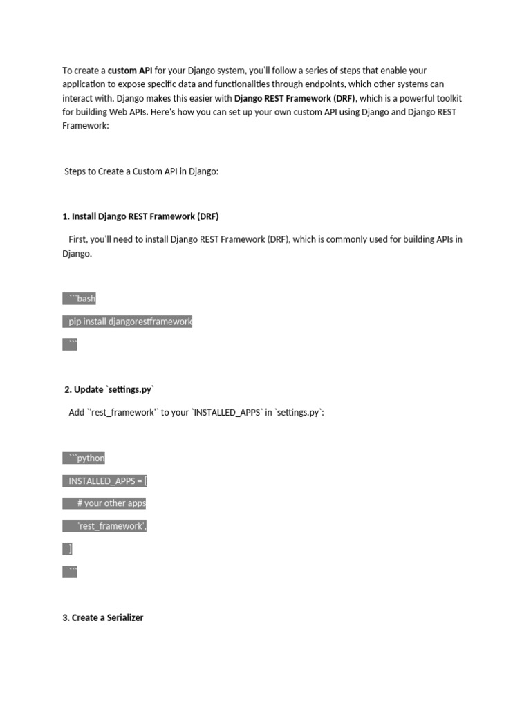 To create a custom API for your Django system, you'll follow a series of steps that enable your
