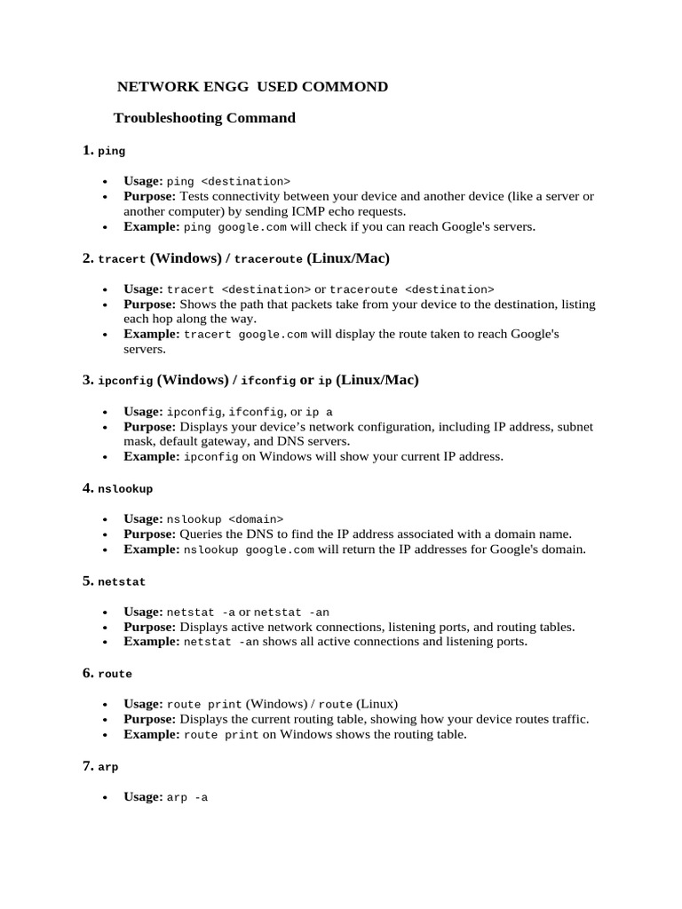 These commands are essential for diagnosing network issues, ranging from connectivity