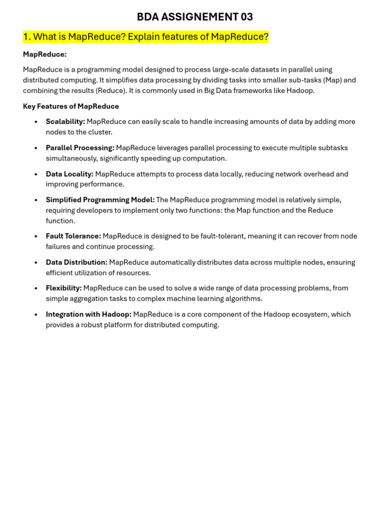 • Fault Tolerance: MapReduce is designed to be fault-tolerant, meaning it can recover from node