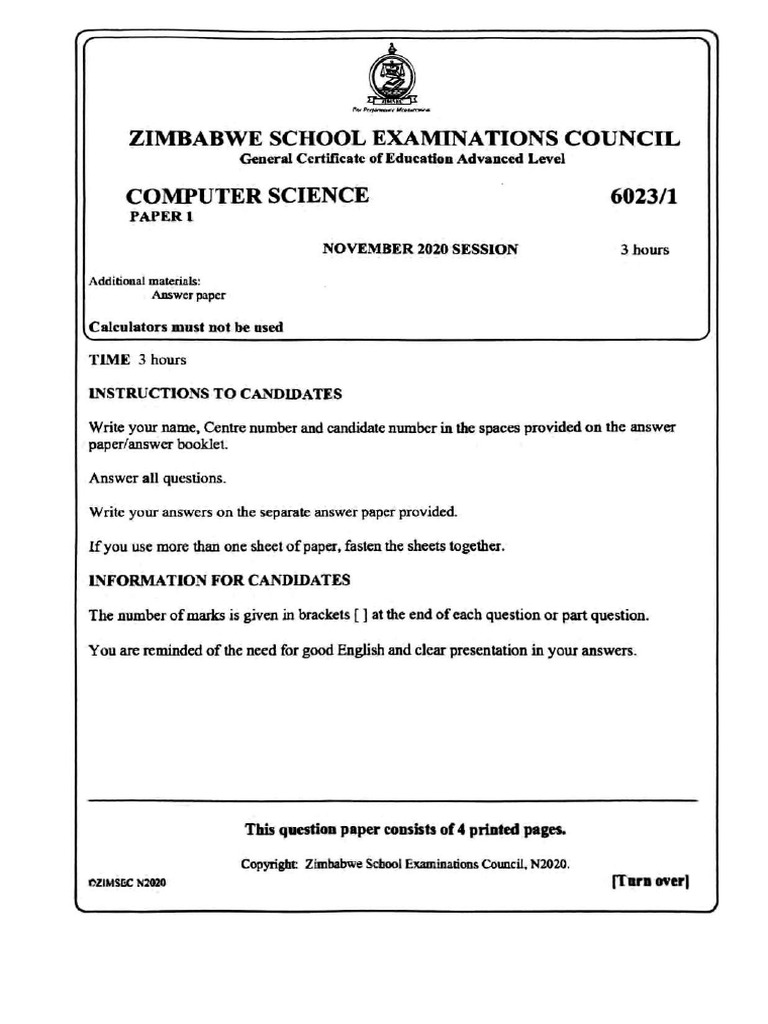 X ZIMBABWE SCHOOL EXAMINATIONS COUNCIL General Certificate of Education Advanced Level COMPUTER SCIENCE 6023/1 PAPER L NOVEMBER 2020 SESSION 3 hours Additional materials: “Answer paper Calculators must not be used TIME 3 hours INSTRUCTIONS TO CANDIDATES Write your name, Centre number and candidate number in the spaces provided on the answer paper/answer booklet. Answer all questions. Write your answers on the separate answer paper provided. Lf you use more than one sheet of paper, fasten the sheets together. INFORMATION FOR CANDIDATES ‘The number of marks is given in brackets [ | at the end of each question or part question. ‘You are reminded of the need for good English and clear presentation in your answers. This question paper consists of 4 printed pages. Copyright. Zimbabwe Schoo! Examinations Council, N2020. ‘8ZIMSEC N2020 [Turn over]() o) @ ) © @) b) © @ Zz Distinguish between overflow and underflow. Explain how accuracy can be improved in a floating point representation and state an effect it has on the number represented. Express the denary value 208 as a @® binary number using an 8-bits, (i) hexadecimal numbes, (ii) number in BCD. Show as 8 bit number in two's complement @ +8, @ -119. Find the product of the binary numbers 101010 and 110000. State any three properties of a variable. Sort the following list using the quick sort algorithm, 426 931777 BLO SSO Distinguish between binary search and linear search. Give one example and one advantage of the following data structures @ static, (i) dynamic. ‘The next instruction to be carried out is LAD#35 which loads the number 35 into the accumulator. ‘With reference to the registers in a processor, use a diagram, to illustrate the stages of the fetch-execute cycle when dealing with this instruction. 02v) Nao 2 QI 1a} [2] [21 (21 [2] fe] GB] 2] 1 [0]a ms monitored using ennora, ‘the wenworn output binary values corresponding to physical conditions ax shown In the table, parameter | description | bluwry of paramotor | value oll prowmure (| prenmure » = 3 bur fo [07 prenintte «9 bur temperature A | temperature: - = 200°C temperature = 200%: rolation ) Revs Per Min (rpm) ‘The outputs of the sensors form the outputs to a logic circuit, ‘The output from the cirouit X is 1, ifthe following three conditions occur: Either oil pressure » = 3 bur and temperature » = 200°C Or oil pressure «3 bar and rotation > 1 000 spm Or temperature » = 200°C and rotation > 1000 rpm (u) Draw a Logie circuit to represent the above system, [6] (b) Complete the truth tuble below for the system. a (a) Define the term protocol, giving an example. (2) (>) (Convert the following IP address to binary. 94 (9% ISS 16 (4) (i) State the type of network the LP address in (I) is suitable for. a (il) Name the two parts which make up the IP address. (21 023 Nam00A school purchases computers and decides that the head's office, the matron’s office and Accounts office, cach have a computer. ‘The rest of the computers are to be put in the computer laboratory. ‘The computers are to be connected through a network. (@) Name the three types of cabling that may be considered and explain the use of cach. (61 (>) Outline any three factors other than cost that they need to consider when choosing suitable cable. (3) (©) Compare wireless and physical network connections. (2) (@) Each league has a number of teams, cach team is in only one league, each team plays in a number of grounds during the season and each ground will host a number of teams during the season. Draw an entity relationship diagram to illustrate this scenario. (5] (b) Outline any five principal duties of a database administrator in a company. (51 (a) Explain any one difference between hacking and cracking. f) (b) Security of data is an important concern for a system administrator. Describe any one feature of a policy for ensuring data security. (21 © © __ Define the term social media. (1) Gi) Outline any three benefits and any three side effects of social media in society. (6 (2) An organisation intends to protect its innovation against competitors on how to manufacture, use and distribute the innovation. Describe any two measures that the organisation can undertake to protect the innovation against its competitors. (41 (b) A High Schoo! has decided to introduce e-learning facilities for the benefit of leamers at the school. @ Explain the term e-learning. (2) @)__Describe any one benefit and any one side effect of e-learning facilities to the learners. (4]& 2 ZIMBABWE SCHOOL EXAMINATIONS COUNCIL General Certificate of Education Advanced Level COMPUTER SCIENCE 6023/2 PAPER 2 Practical NOVEMBER 2020 SESSION 3 hours Additional materials: LCD foreach candidate, Printing facility, Bond Paper, TIME 3 hours INFORMATION FOR CANDIDATES This is a purely practical paper. All answers should be printed. Handwritten answers will not be marked. This paper consists of three sections. Section A 20 marks Section B 50 marks Section © 30marks Answer one question from each section. Each answer sheet should include the following information in the header section: © Candidate Name and Candidate Number * Centre Name and Date © Subject Code When answering programming questions, indicate the language used. All work should be backed up by a soft copy on a CD. Ifa candidate prints on more than one sheet, fasten together with string. All answers should be correctly and clearly numbered. This question paper consists of 8 printed pages. Copyright: Zimbabwe School Examinations Council, N2020. ezmissc nem [Turn overSection A [20 marks] Answer any ane question from this section. Use a spreadsheet of your choice fo simulate the following logic of the worksheet. () Use only the following formulae: D>-“=D-~ =)>— XOR() —f>o—-0re Simulate the circuit below on the spreadsheet and complete the truth table that follows. ——~ 4 o> Lp = [oui (51 (b) Draw the Von Neuman and Harvard architecture explaining their diffe