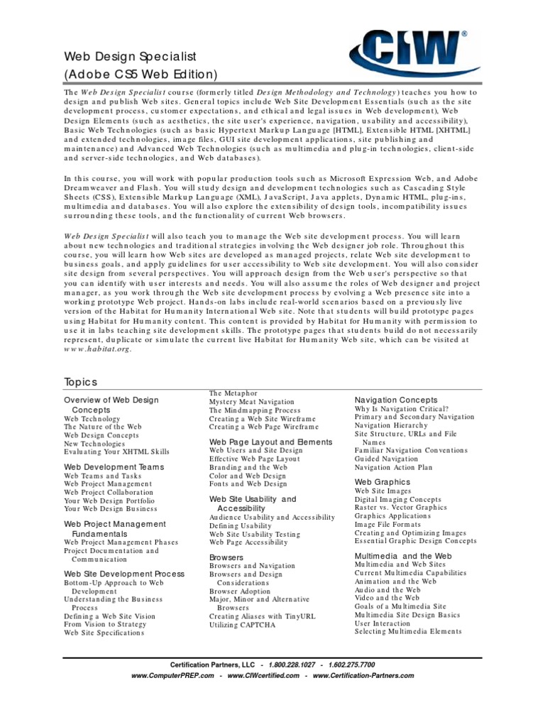 The Web Design Specialist course (formerly titled Design Methodology and Technology) teaches you how to design and publish Web sites. General topics include Web Site Development Essentials (such as the site development process, customer expectations, and ethical and legal issues in Web development), Web Design Elements (such as aesthetics, the site user's experience, navigation, usability and accessibility), Basic Web Technologies (such as basic Hypertext Markup Language [HTML], Extensible HTML [XHTML] and extended technologies, image files, GUI site development applications, site publishing and maintenance) and Advanced Web Technologies (such as multimedia and plug-in technologies, client-side and server-side technologies, and Web databases). In this course, you will work with popular production tools such as Microsoft Expression Web, and Adobe Dreamweaver and Flash. You will study design and development technologies such as Cascading Style Sheets (CSS), Extensible Markup Language (XML), JavaScript, Java applets, Dynamic HTML, plug-ins, multimedia and databases. You will also explore the extensibility of design tools, incompatibility issues surrounding these tools, and the functionality of current Web browsers. Web Design Specialist will also teach you to manage the Web site development process. You will learn about new technologies and traditional strategies involving the Web designer job role. Throughout this course, you will learn how Web sites are developed as managed projects, relate Web site development to business goals, and apply guidelines for user accessibility to Web site development. You will also consider site design from several perspectives. You will approach design from the Web user's perspective so that you can identify with user interests and needs. You will also assume the roles of Web designer and project manager, as you work through the Web site development process by evolving a Web presence site into a working prototype Web project. Hands-on labs include real-world scenarios based on a previously live version of the Habitat for Humanity International Web site. Note that students will build prototype pages using Habitat for Humanity content. This content is provided by Habitat for Humanity with permission to use it in labs teaching site development skills. The prototype pages that students build do not necessarily represent, duplicate or simulate the current live Habitat for Humanity Web site, which can be visited at www.habitat.org.