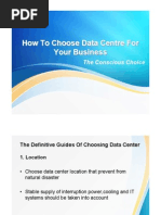 from major ISPs in your country like in Singapore, it is Singtel. Some major networks are covered at : http://www.geog.ucl.ac.uk/casa/mart s/isp_maps.html . When selecting multiple ISPs you must select ISPs using different backbones so you have connectivity atleast one provider when a backbone goes down. 6. Power Delivery/ UPS Continious power supply is the most important requirement along with connectivity to have 0% outages for the servers. Multiple power backups are preferred. Depending on the number of server you will accomodate you need to place the power backup infrastructure. A combination of battery backups plus heavy duty diesel generators is generally preferred in most leading datacenters of the world. The idea is to maintain power supply through battery backups till generators become operational in times of power grid failures. If you can build a backup infrastructure to give you about 24 hours of backup it is more than sufficient for normal power outages. 7. Airconditioning / Fire Control Equipment /Security . Servers are bound to get heated due to their continious working. A temperature controlled environment is very essential for proper functioning of the servers. When calculating power backup capcity you must consider airconditioning use as well. The temperature of the server rooms need to be maintained at 20-22 degrees celcius at all times. With the thousands/millions of wires connecting the servers to the power sources and connectivity sources, they are prone to some short-circuits which at times can cause fire. Fire control equipment needs to be installed in every room with automated triggering functions to prevent any damage. There are various types of fire control equipments available to opt from. Equipments which will not cause direct harm to server hardware should be selected. Use of liquid extinguishers should be avoided. Mist entinguishers can be used at the most. You also need to have security equipments in place to protect any critical or confidential data that the servers might be handling. Secure entry, logging of each visitor, limited staff access to actual server rooms, video camera monitoring are some things you need to implement for security. 8. Hardware / Internal Network With the amount of investment being put in it is necessary to have reliable and robust hardware for best performance of the server. We will discuss about the server hardware itself in a seperate topic. Apart from servers hardwares like cables, routers, switches, racks etc. are also needed. You need to form a rigid internal network structure which should include backups for each active network when designing your internal network. We will discuss the contructions of the internal network and the exact applications of each hardware in the Actual Setup of a Datacenter article to follow. 9. StaffDatacenters operate 247 and so you need to have staff