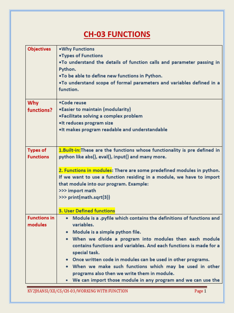 KV2JHANSI/XII/CS/CH-03/WORKING WITH FUNCTION Page 1