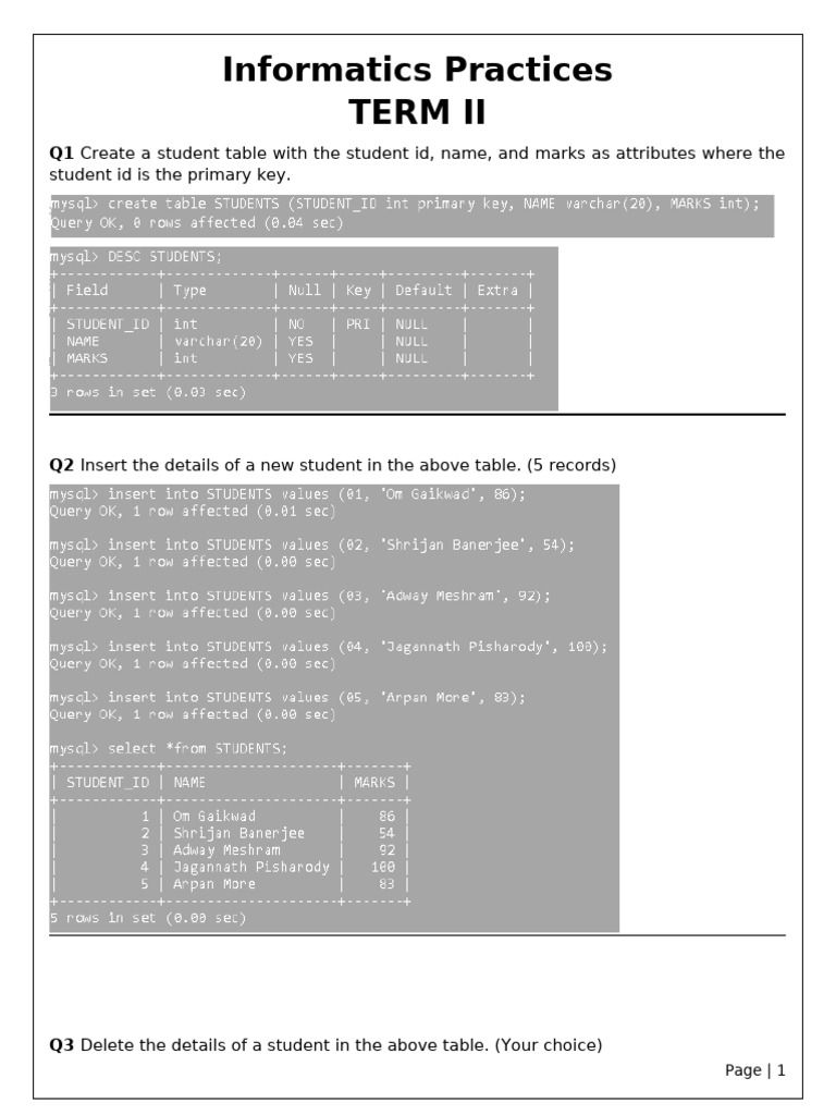 Q1 Create a student table with the student id, name, and marks as attributes where the
